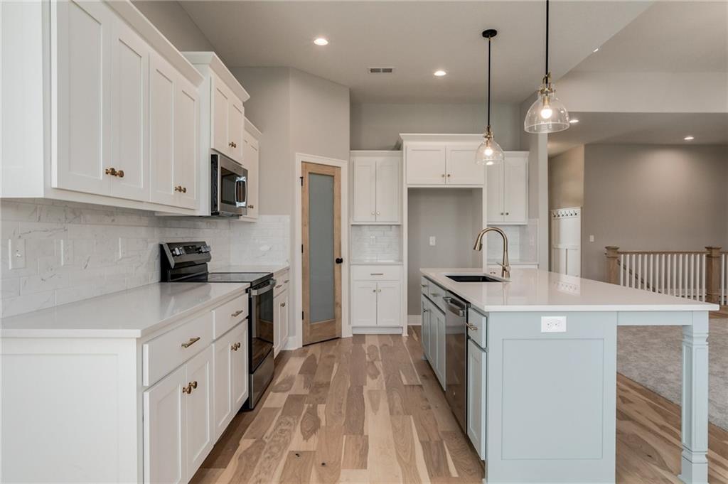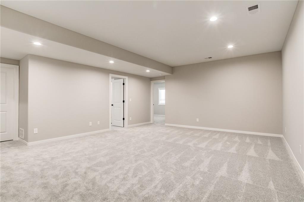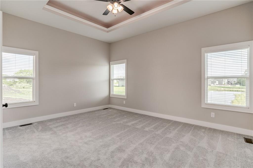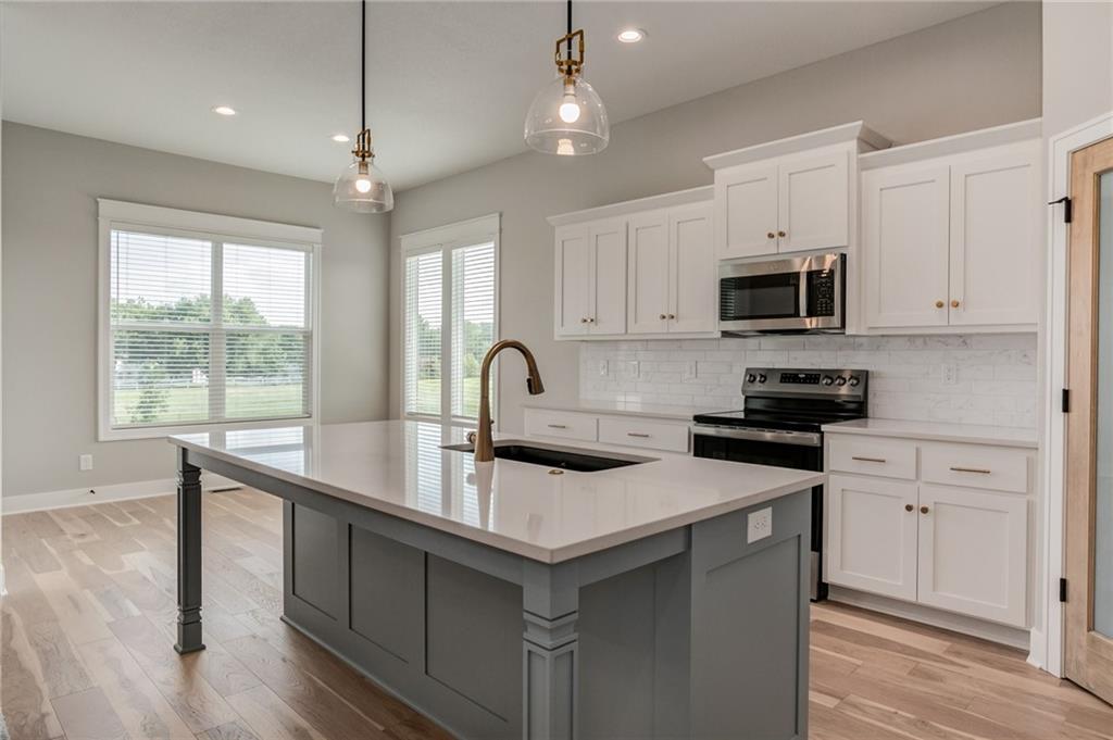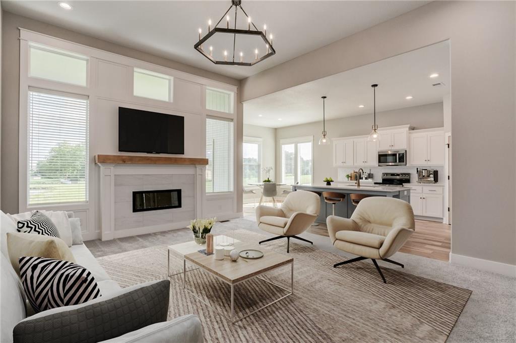The Colleen by Martens Family Enterprises in a new layout. Wider great room, and new master bath layout with added privacy glass window. Beautiful open floor plan with vaulted ceilings and additional windows. Matte black faucet package upgrades and Champagne Bronze kitchen faucet upgrade, Free-Standing tub upgrade in the master bath, covered patio, and covered front porch. Finished basement with 9ft foundation walls. 8lb carpet pad, 3rd row of vertical storage in master closet with additional custom shelving. Vaulted ceiling with LED ambient lighting in the master bedroom. Linear electric fireplace upgrade with heat, Extended kitchen cabinets, and quartz countertops throughout. Extensive trim upgrades including cubed wood spindles, Accent wall behind the Fireplace, Custom floating mud bench with added upper cubbies, and added coat hook in entry. Smart thermostat. 2-inch faux-wood blinds, sprinkler system, and smart garage door openers are standard. Backs to the Area Retention pond. Area HOA Pool has an extended pool season due to it being a Heated Pool with a splash zone and slide, a Stocked Fishing lake with trails, a fire pit, a picnic shelter, and a playground. Home can close in as little as 7 days from the final walkthrough. Taxes/sqft are estimated. NOTE: SOME PHOTOS ARE DIGITALLY STAGED.