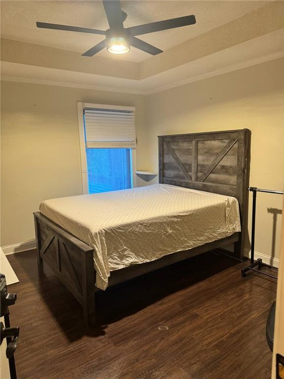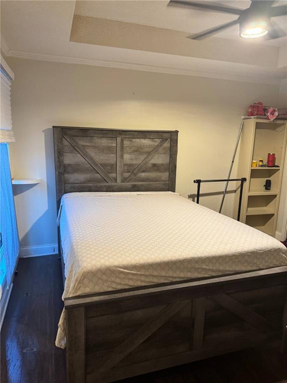 Bedroom with crown molding, wood finished floors, a ceiling fan, and a raised ceiling