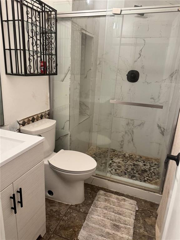 Bathroom featuring vanity and a shower stall