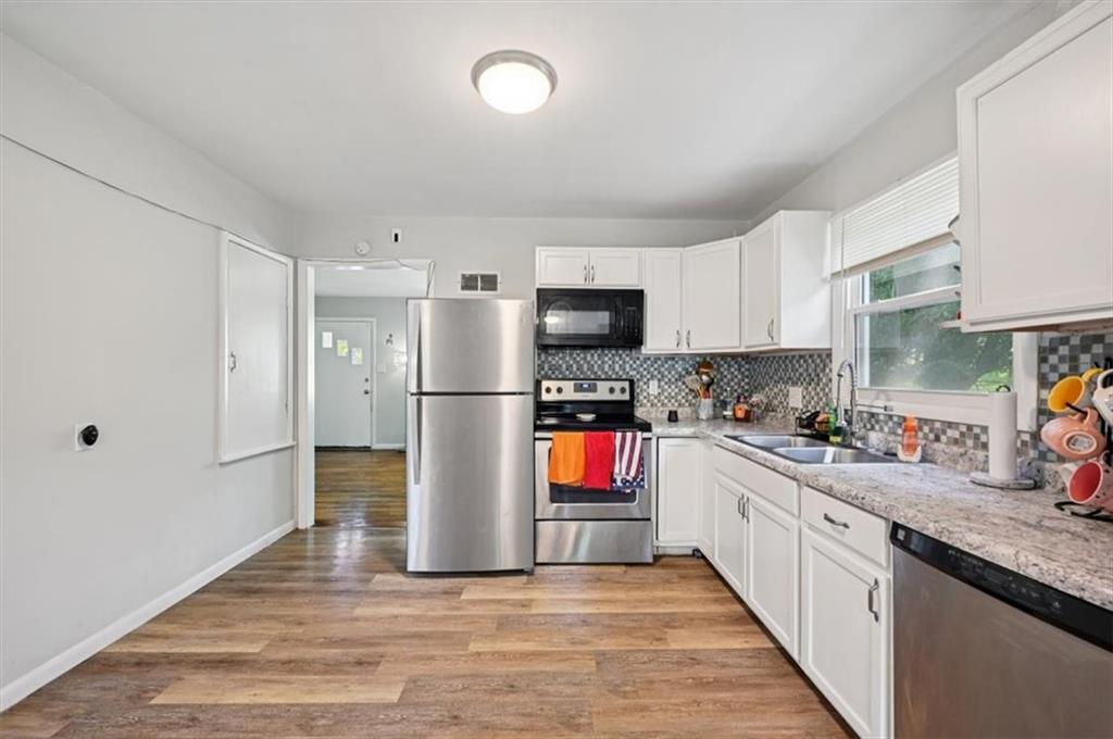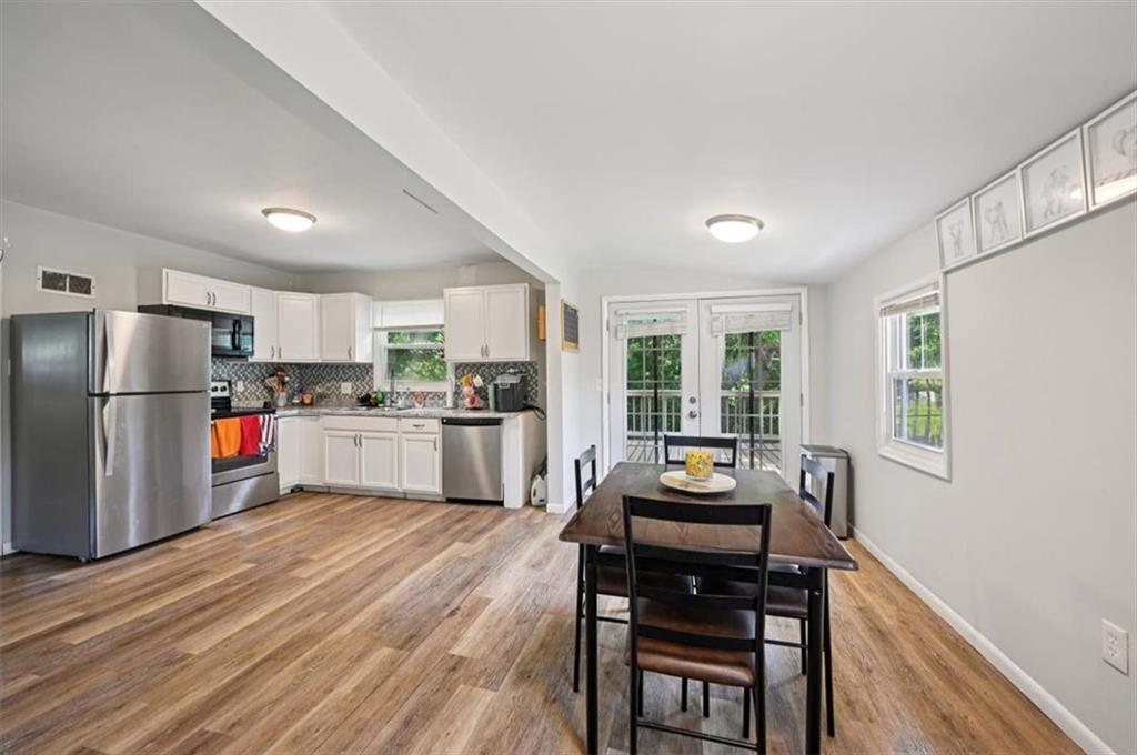 Now vacant and ready to move in! This 3 bedroom 2 bath home has original hardwood floors in the living room and 2 bedrooms. New carpet in the back bedroom. Spacious kitchen has stainless steel appliances that stay and an eat-in dining room with french doors that go out to the back deck. Lots of recent updates to include new privacy fence in the back with sliding drive through gate, newer paint inside and out and newer HVAC. Second full bathroom and laundry is in the basement. Large fenced yard. Great starter home or investment property. Easy access to Fort Leavenworth.