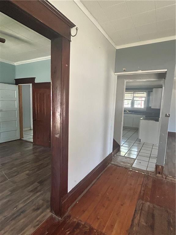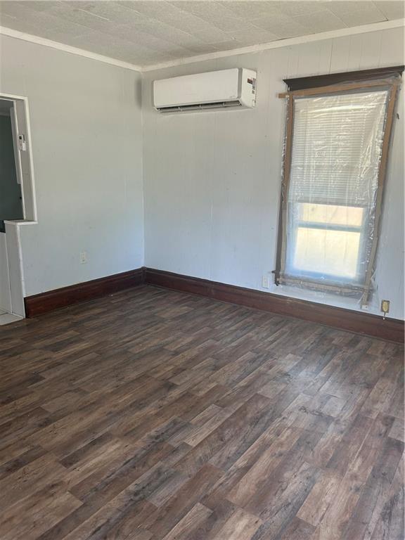 Unfurnished room with a wall mounted AC, dark wood-style floors, and ornamental molding