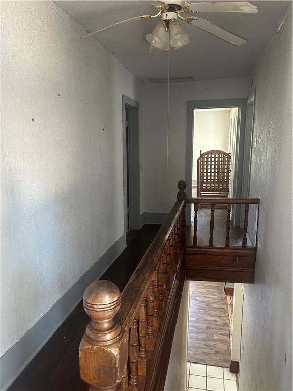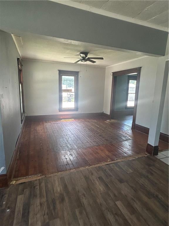 Unfurnished room featuring wood-type flooring, plenty of natural light, and a ceiling fan