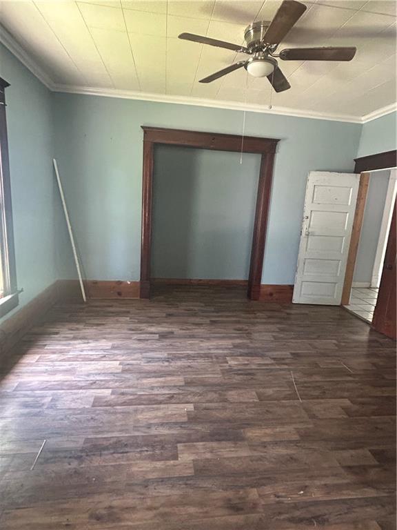 Unfurnished room with dark wood-style floors, ceiling fan, and crown molding