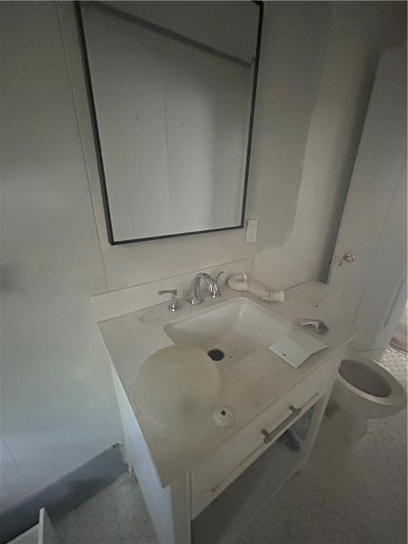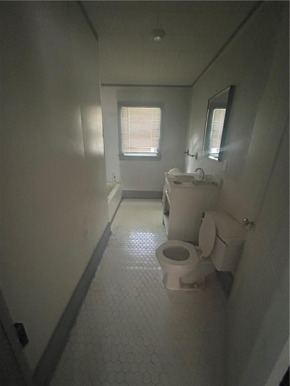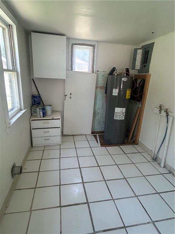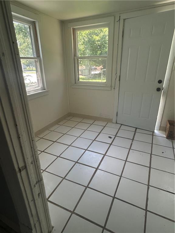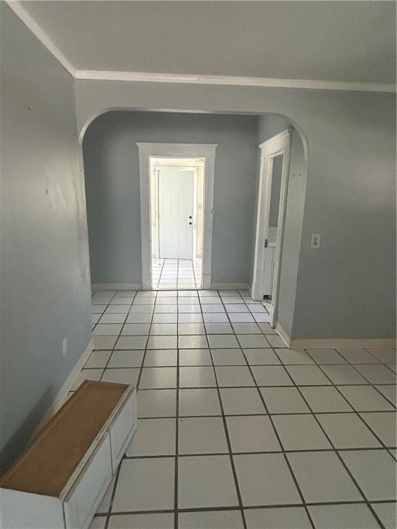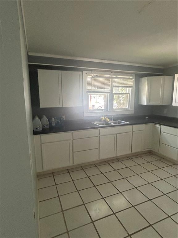 Kitchen with white cabinetry, dark countertops, and light tile patterned floors