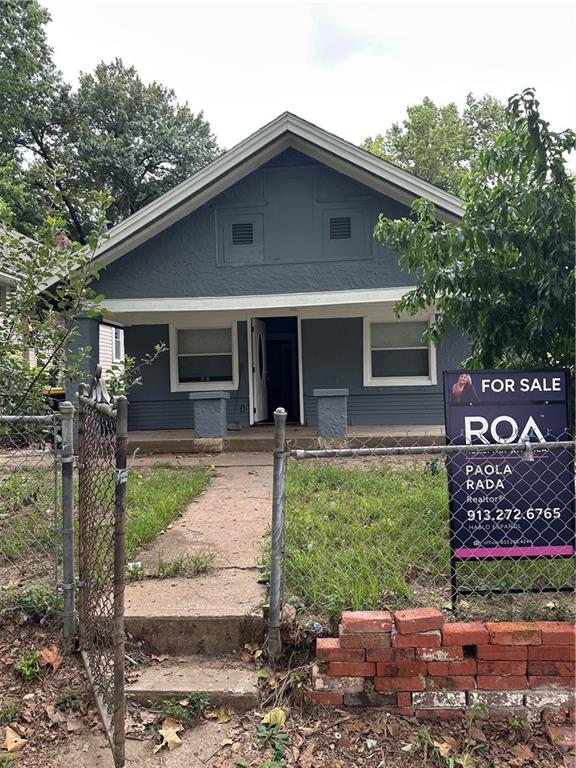 Bungalow-style home with a fenced front yard, a gate, and a porch