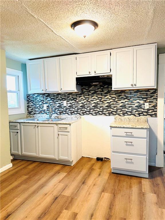 Kitchen with light countertops, backsplash, light wood-style flooring, under cabinet range hood, and white cabinetry