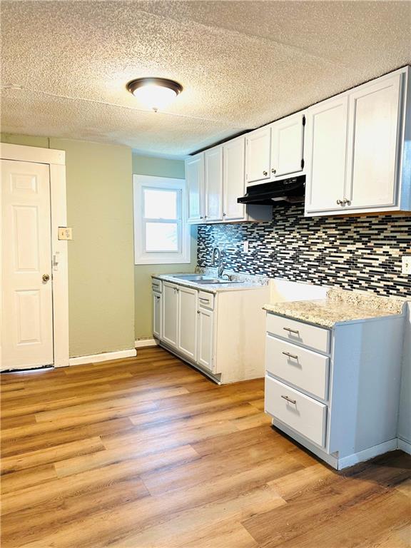 Kitchen featuring light countertops, decorative backsplash, light wood-style flooring, white cabinetry, and a textured ceiling