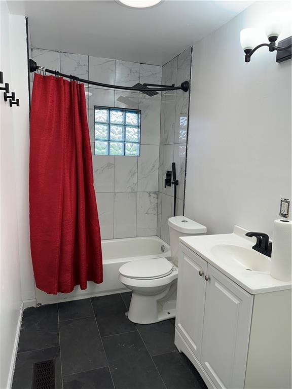 Full bath featuring shower / bath combination with curtain, vanity, and tile patterned floors