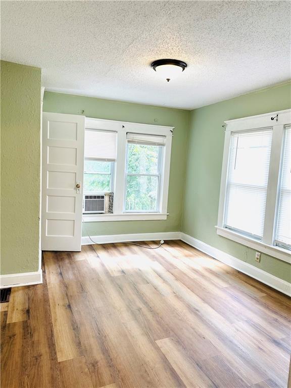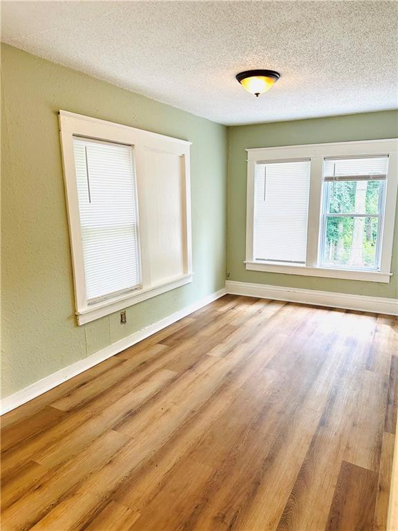 Unfurnished living room featuring a textured ceiling, a stone fireplace, and light wood-style flooring