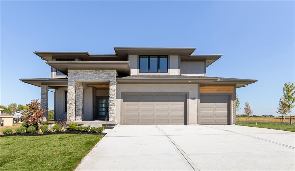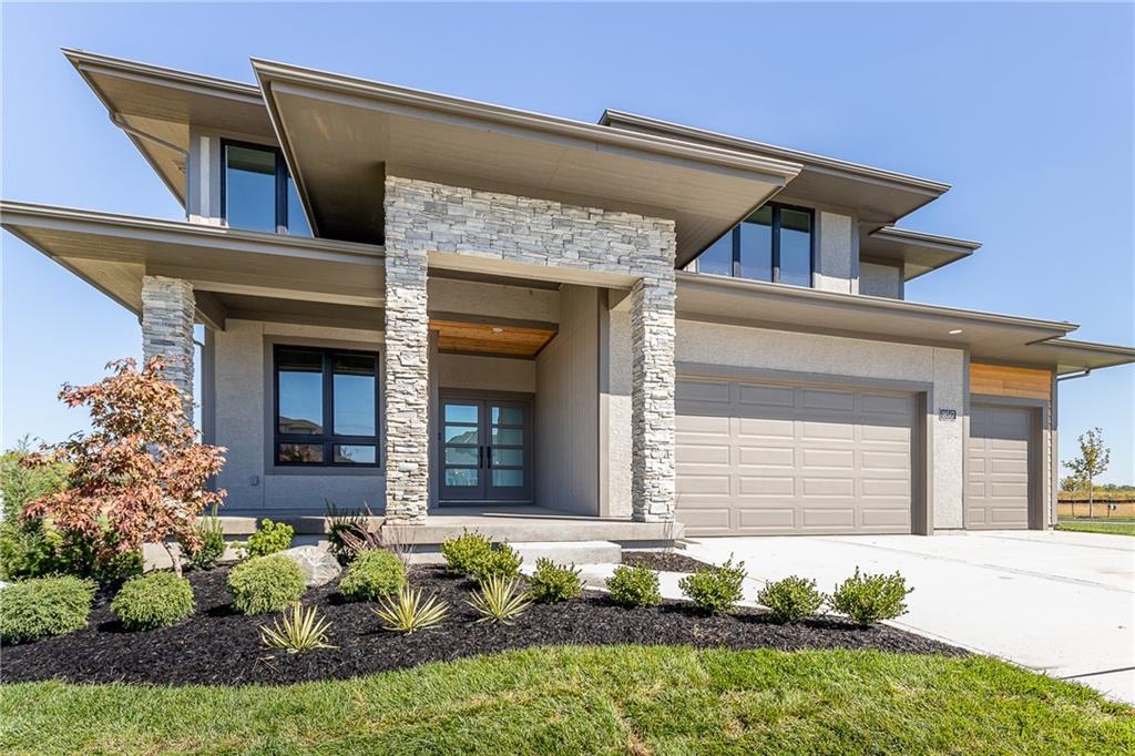 Welcome to Overland Parks highly sought after community, Southern Meadows. This award winning Makenna I 2 story home by Gabriel Homes sits on lot 57 and features everything you are looking for. Fantastic level lot with serene farm views and dynamite curb appeal. This wildly popular floor plan features a contemporary modern elevation, 4 bedrooms, 3.5 baths and main floor office perfect for those work from home days. Enjoy a large family room that features impressive fireplace with built in’s and large windows. Opens to an incredible kitchen filled with custom cabinets, large island and huge walk in pantry. Fantastic covered low maintenance deck perfect for those scenic summer BBQ’s. 2nd floor is equally as impressive with an enormous master suite, 2 shower heads, free standing tub, and large walk in closet. Additional features in this home include double doors at entry, daylight basement, 10’ ceilings on first floor, irrigation system, Trimmed ceiling detail at foyer, painted kitchen cabinets and more. Incredible value in highly desired area. Home is currently framing with an estimated completion date of Spring 2026. Still time to make all of your color selections. Pictures of finished home are same floor plans. Finishes and colors will vary. This neighborhood falls within the award winning Blue Valley schools. Known for great highway access yet a peaceful and serene surrounding you will be in awe from the moment you step foot into this community.