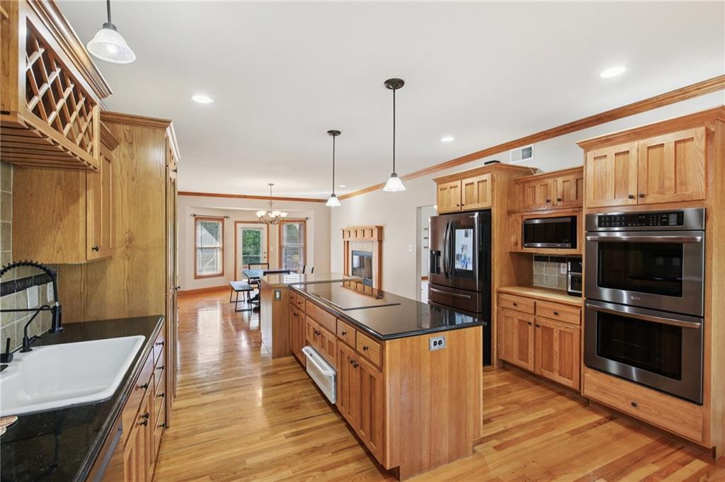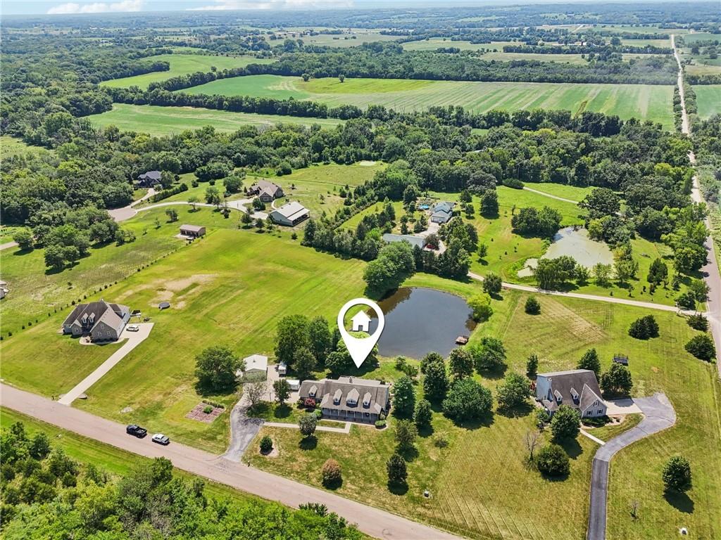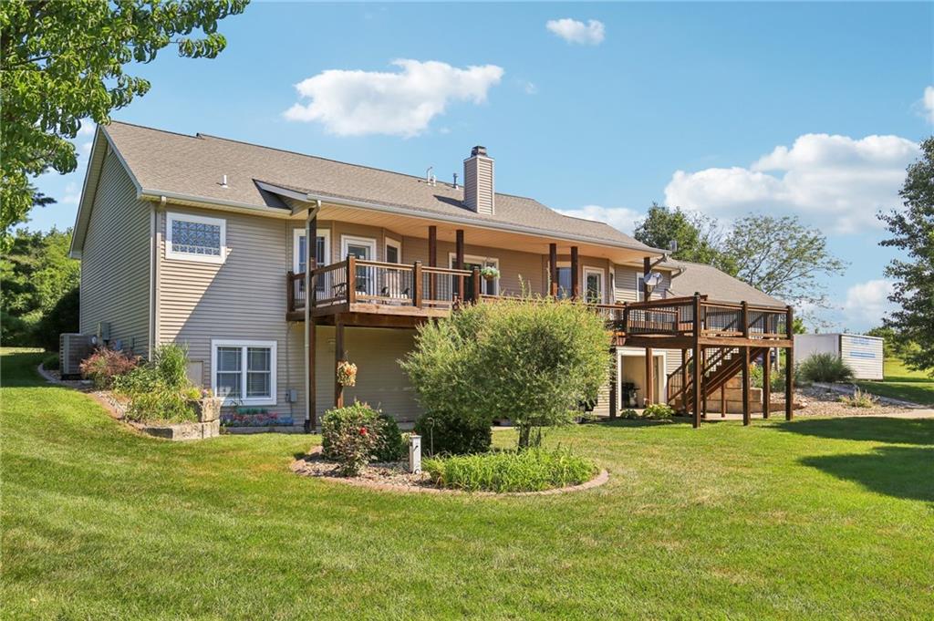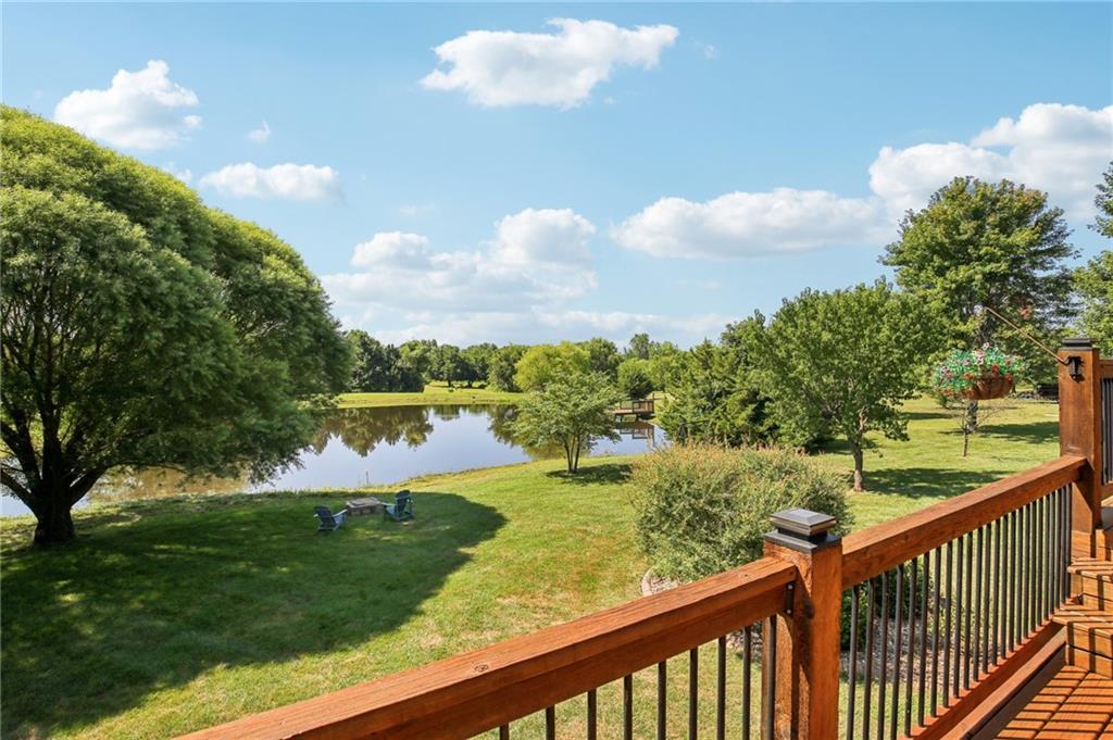 This stunning home is designed for both comfort and entertainment, set on a generous almost 3 acre lot that offers plenty of space for outdoor activities. As you enter the home, you're greeted by a spacious foyer that leads into the inviting living room area where you'll find a double sided fireplace and large windows that bathe the space in natural light and provide beautiful views of the backyard space. In the kitchen you will find ample counter space, an oversized island, and a walk in pantry. Adjacent to the kitchen is a spacious dining area which is where you will find a doorway to the large deck making it ideal for everyday meals and entertaining. The large deck extends the living space outdoors, offering a perfect spot for morning coffee, summer barbecues or peaceful evenings overlooking the pond. Each of the five bedrooms is generously sized and equipped with walk-in closets, providing plenty of storage and personal space. The primary suite is a true retreat with double doors leading onto the deck, complete with an en-suite bath featuring a jetted tub, separate shower, and dual vanities. The walkout basement is a true highlight with a large family room equipped with a pool table and a shuffleboard to supply extra entertainment for any occasion. A kitchenette adds convenience for snacks and refreshments. This area includes a patio with a hot tub where you can unwind after a long day. For those who need extra space for hobbies or storage, the home features 3 garage spaces, one with an EV charger and a shop with extra space for vehicles, tools, or even a workshop. The outdoor space is equally impressive, with fruit trees, and a large stocked pond, ideal for fishing or simply enjoying nature on the dock. The expansive yard offers plenty of room for gardening, outdoor gatherings, or recreational activities.