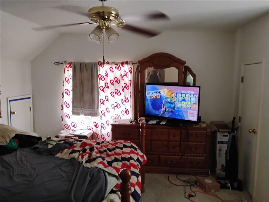 Carpeted bedroom #1 with vaulted ceiling and ceiling fan