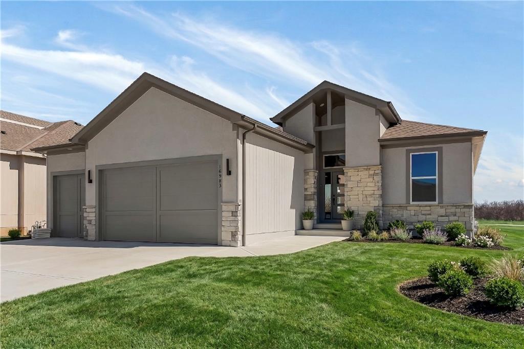 Stonebridge Villas, New Construction. The Grayson by New Mark Homes. 0.8 mi to Heritage Park • Open reverse 1.5-story 30 days to completion! The Grayson by New Mark Homes offers open-concept main-level living with 3 bedrooms, 3 baths, and a 3 CAR GARAGE! Great room features fireplace with built-ins and large windows for natural light. Kitchen includes island seating, walk-in pantry, gas cooktop, and double wall ovens. Dining area opens to covered patio for outdoor dining. Primary suite with dual vanities, tiled shower, and spacious walk-in closet connects to laundry and mudroom. Lower level includes DAYLIGHT family room, bedroom, full bath, and unfinished storage. EAST BACKING backyard with covered patio and level lawn. Located near Heritage Park, Olathe Lake, shopping, and highway access. Includes photos of a similar model.