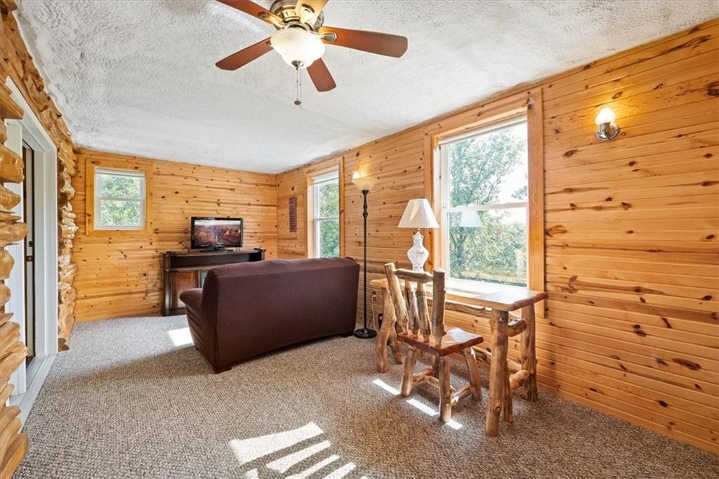 Dreaming of a lake get away? Welcome to this beautifully maintained 2-bedroom, 2-bath cedar log-sided home on approximately 8 acres, nestled on a serene lot that backs up to core land of Truman Lake. Whether you’re looking for a weekend getaway, full-time retreat, or lake lover’s dream, this property offers the perfect blend of privacy, comfort, and functionality. Selling fully furnished - as turn-key as they come, step inside and you’ll be greeted by cedar walls, gleaming hardwood floors, and a stunning stone wooden fireplace. The updated kitchen is both stylish and functional, featuring double ovens, gas stove, granite countertops, custom cabinets, tile backsplash, and newer stainless steel appliances. Laundry is located on the main level. Both bedrooms are generously sized with large closets and updated bathrooms that include tiled flooring and spacious walk-in showers. One bedroom offers direct access to the back deck, perfect for enjoying your morning coffee with a view. Enjoy outdoor living with a covered front porch and a large covered back deck overlooking peaceful woods and wildlife. The basement offers the potential for additional living space or ample storage for lake gear, ATVs, or hobbies. The property includes a 30x40 Quonset outbuilding with concrete floors and electricity, plus multiple pole barns, ideal for storing boats, equipment, or working on your next project. The pole barn directly behind the outbuilding has electricity running to it as well. Property is own it's own private well. Find mature Hickory, Oak, and Cherry trees throughout the timber. Located minutes away from restaurants, boat rentals, motels, RV parks, marina/boat slips, and more! This property is a must see!