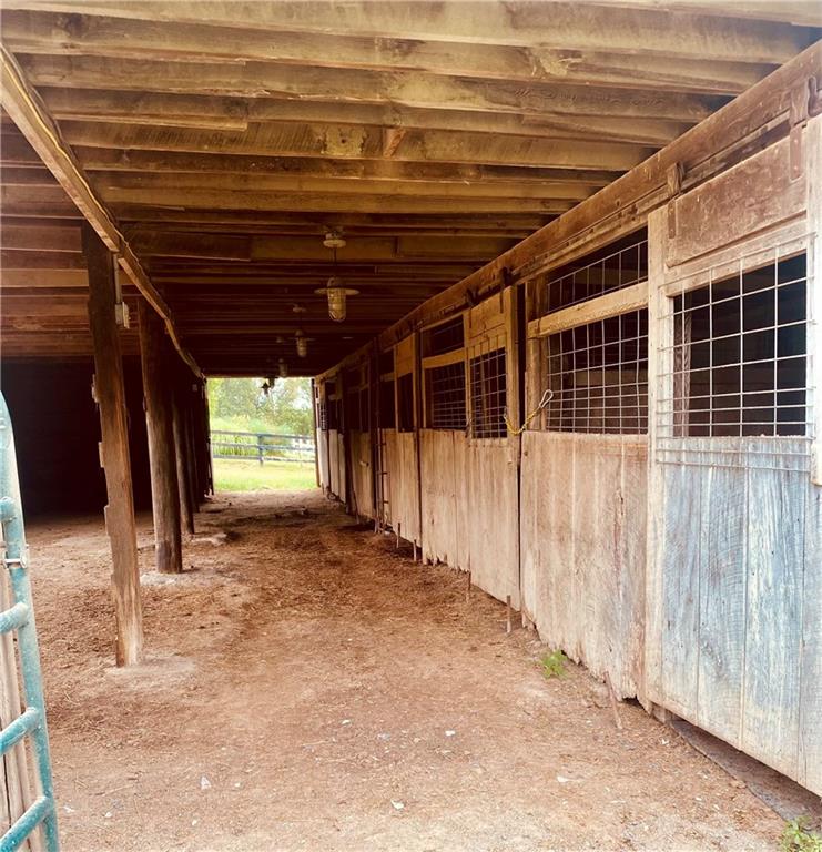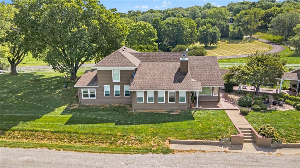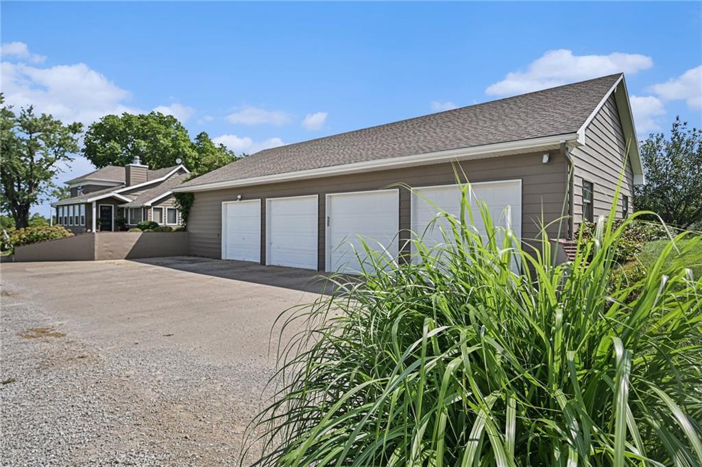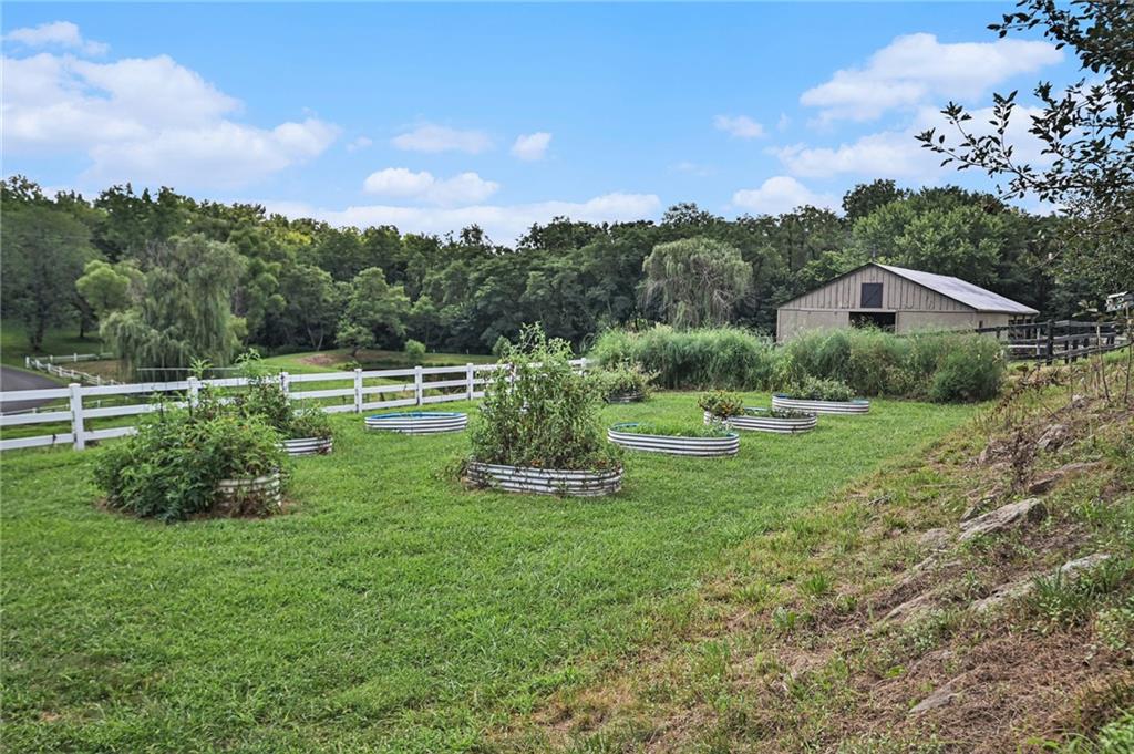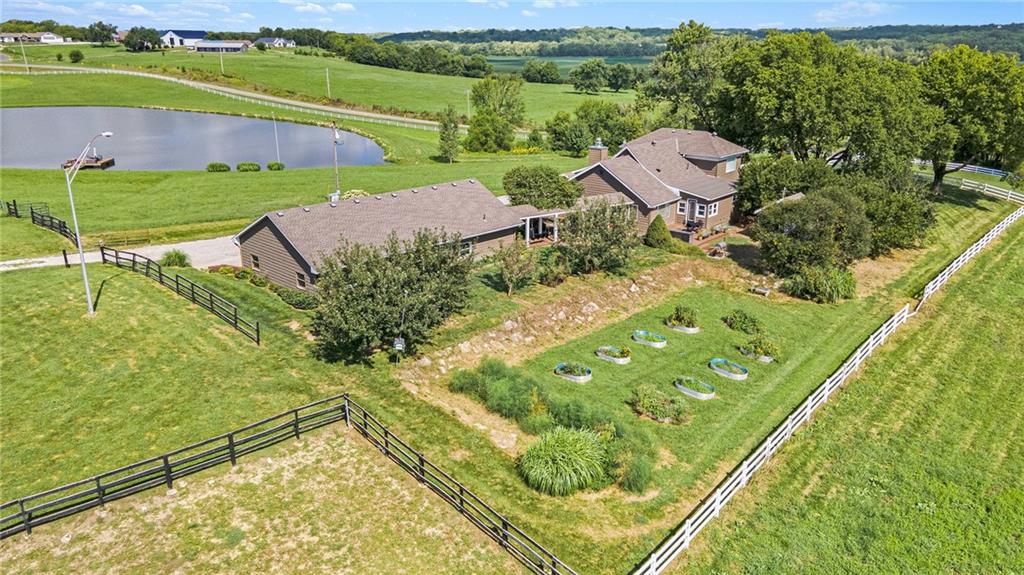 This gated property offers a unique blend of tranquility and modern living, situated on 29 picturesque acres with breathtaking views, including a 6-acre pond. The landscape features rolling hills and a variety of fruit trees, including apple, cherry, plum, pear, and peach. The equestrian enthusiast will appreciate the 7-stall horse barn equipped with electricity, a sheep barn and tractor barn, providing ample space for all your needs. A 4-car detached garage with large doors, perfect for SUVs and trucks, featuring a convenient 1/2 bath and an 8x12 concrete storm shelter for added safety. Enjoy outdoor living with covered patios and walkways leading to the garage, perfect for entertaining or relaxing. The home itself has been completely remodeled, featuring all new wiring and plumbing, a stunning kitchen with custom cabinets, high-end appliances, a butler's pantry area that any chef would adore. The primary bath and closet have also been fully renovated. The home features a newer roof, new HVAC , new windows, combining the charming character of an old farmhouse with the modern conveniences of today. The property is powered by GEOTHERMAL energy ensuring efficiency and sustainability. The pond is complete with a dock & stocked with bass, crappie, perch, and catfish. Experience the best of country living while being conveniently close to amenities and the airport. Don't miss this opportunity to own a slice of paradise!
