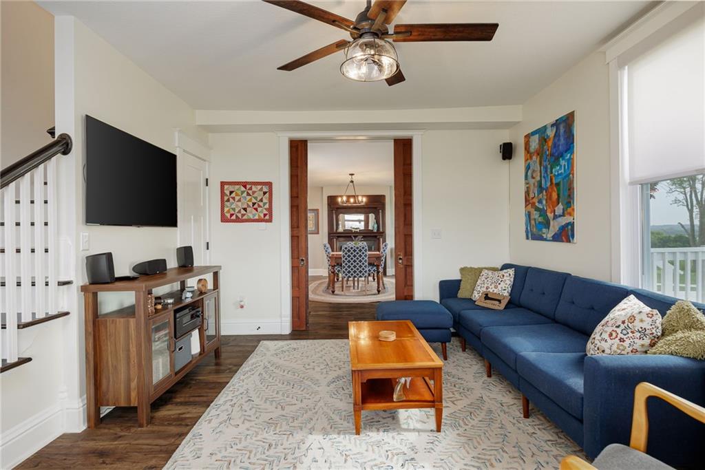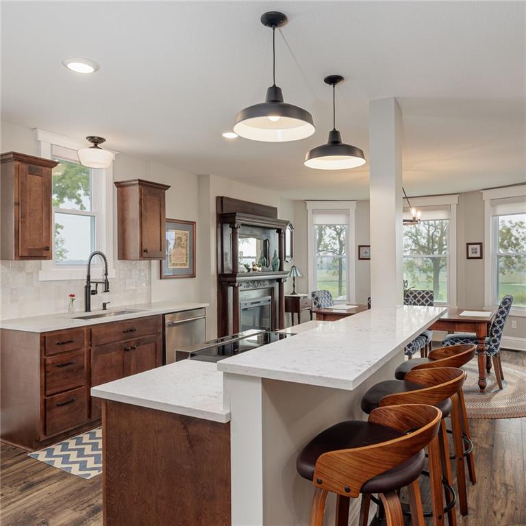 The views! You can see for miles from this beautifully renovated 1895 farmhouse that perfectly blends modern comfort with timeless character. Renovated in 2023 down to the studs and further enhanced in 2024 with a new garage, concrete driveway, and interior updates, this 3-bed, 2.5-bath home is move-in ready and one of a kind. Relax on the composite porches or entertain in open living and dining areas with a fireplace, built-in office nook, and a gorgeous kitchen with large island and ample storage. Two detached garages offer abundant parking and workspace—one 2-car near the house and another down the hill with 220V power and tandem space for up to 4 vehicles. The full stacked-stone basement adds storage and includes an extra room under the porch with a cozy speakeasy vibe. A spacious unfinished attic with dormer windows offers potential for future living space. With sweeping views, efficient modern systems, and thoughtful updates, this home has the perfect blend of character and convenience.