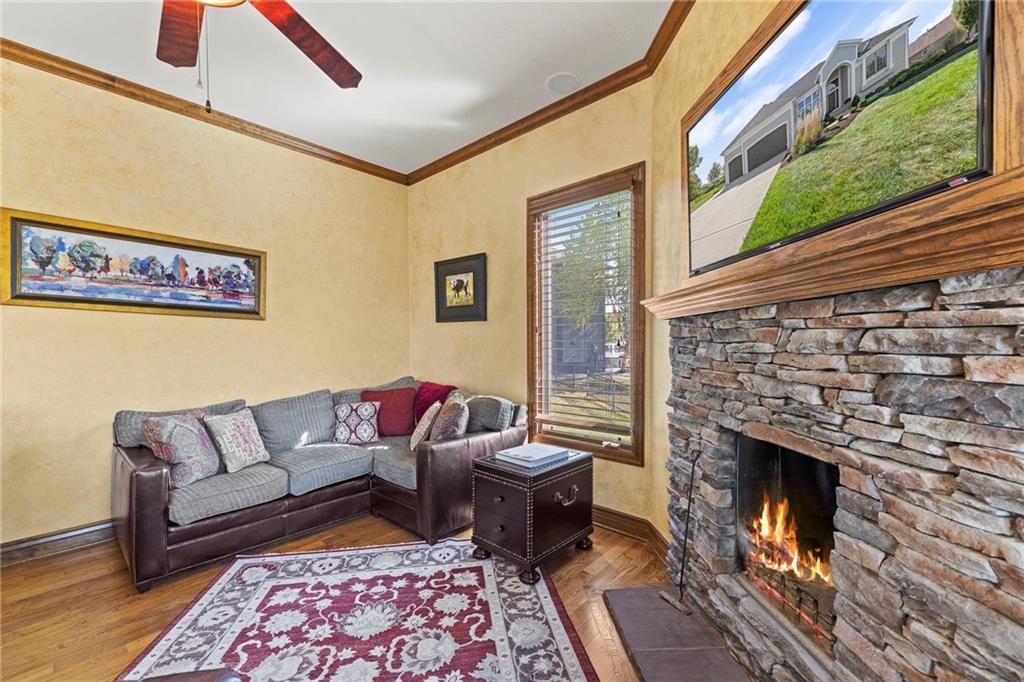 Gorgeous 4000+sf reverse 1.5 story with 3 fireplaces including hearth room off kitchen, great room and master bedroom! New screened in deck, finished walkout lower level with wetbar and 3 bedrooms. Kitchen features stainless appliances, large island, bar seating and granite counters! Fresh paint and new carpet in entire main level! Cul-de-sac location and De Soto school district! Neighborhood Pool too!