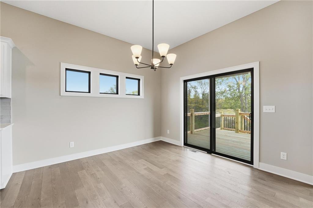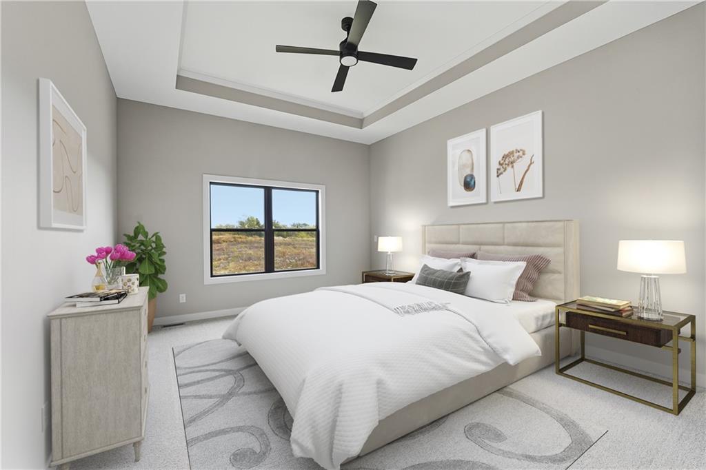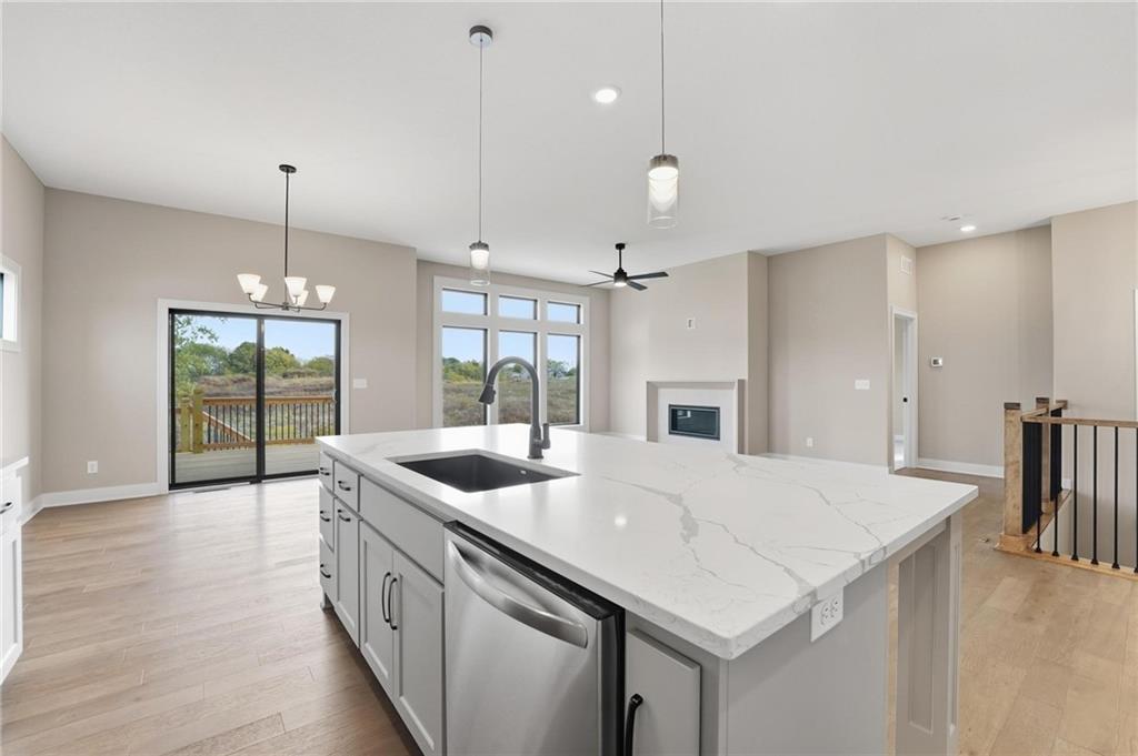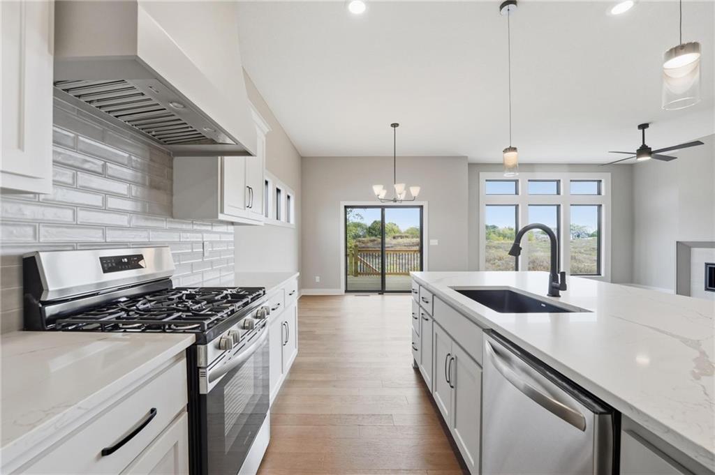 MOVE-IN READY! The McKinley by Hearthside Homes – Reverse 1.5 Story in Cadence. This thoughtfully designed home offers 4 bedrooms, 3 baths, and over 2,800 sq ft of well-appointed living that blends comfort, craftsmanship, and modern style. The open-concept main level features hardwood floors, abundant natural light, and a great room anchored by a sleek linear fireplace. The kitchen impresses with quartz countertops, a contrasting island and hood, under-cabinet lighting, and a black Silgranit sink—balancing beauty and function. The dining area opens to a covered deck overlooking the backyard. The primary suite delivers a true retreat with a freestanding tub, tiled shower, dual vanities, and a spacious walk-in closet that connects directly to the laundry room. A secondary bedroom, full bath, and laundry complete the main level. The finished walkout lower level adds a large rec room with wet bar, two bedrooms with walk-in closets, a full bath, and storage. Upgrades include an I-joist floor system for quiet, solid floors, black windows, covered deck, and an oversized patio backing to greenspace for private outdoor living. Cadence offers amenities including a community pool, scenic walking trails, and walkability to Platte Purchase Park. Every Hearthside home includes a 12-month builder warranty, third-party inspections, a verified video sewer line scope, and professional HVAC duct cleaning—ensuring your new home is delivered in pristine condition. Taxes, square footage and room sizes are estimated.