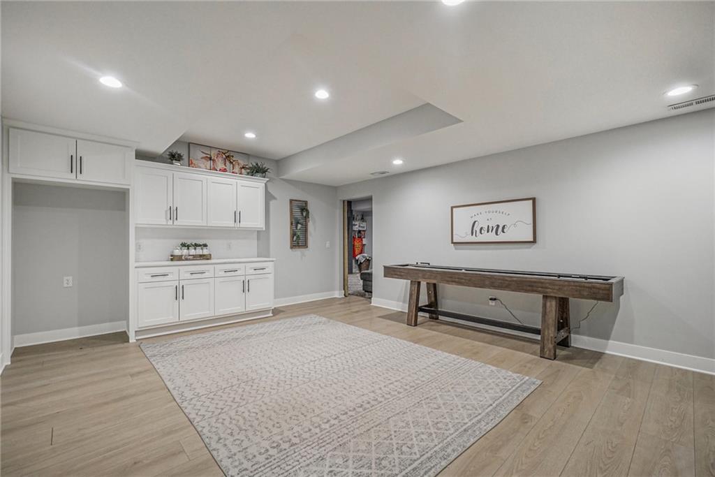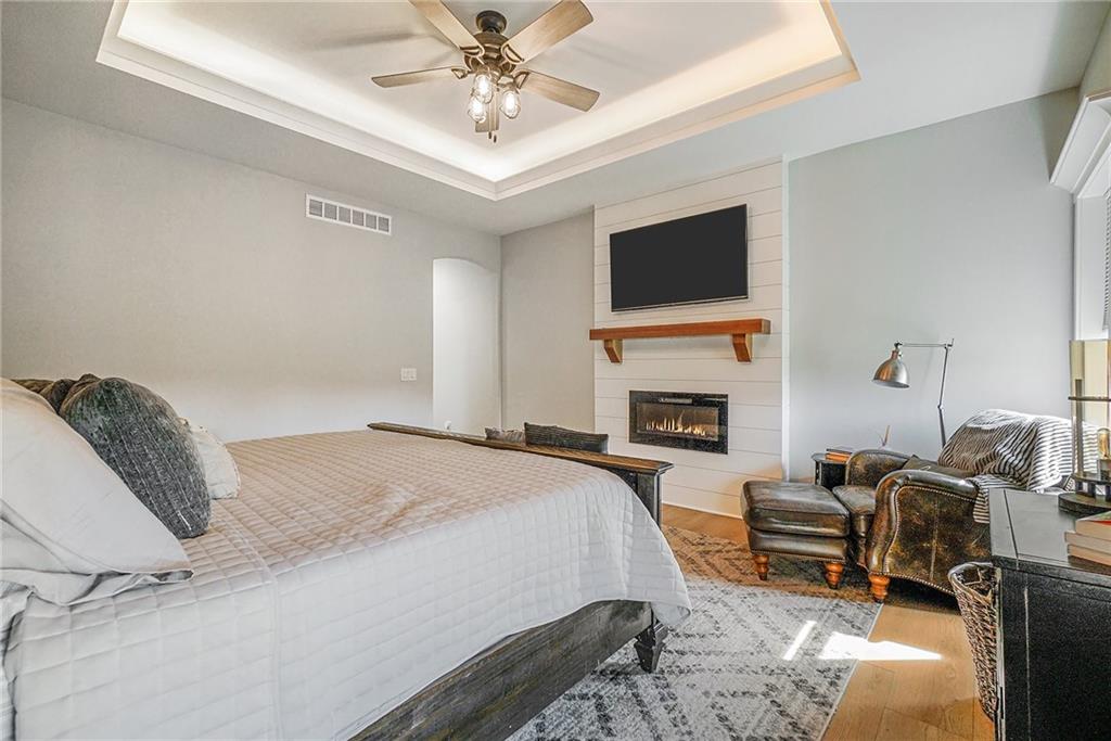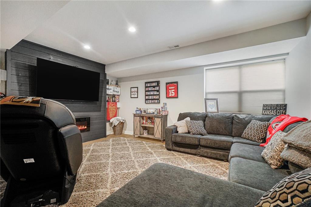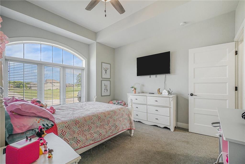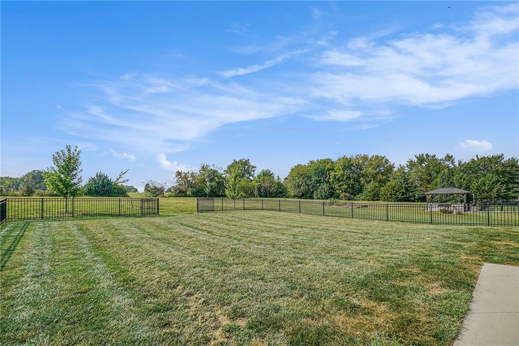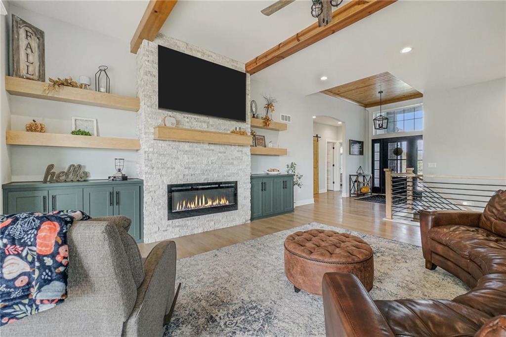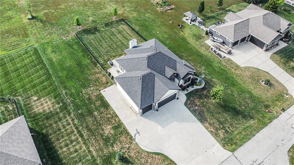 Beautiful 5-bedroom, 4.5-bath reverse 1.5-story home in the popular Shadow Glen of Peculiar. Sitting on 1 acre & backing to open farmland, this tastefully modern home, framed in 2x6 construction, features a fenced portion perfect for kids, pets, or a pool. The oversized 3-car garage with high ceilings includes a tandem bay for storage, a workshop, or even a golf simulator, plus a 40+ ft pad with a 50-amp connection for an RV or trailer. Inside, light, modern tones leading to a spacious open living, kitchen, & dining area. Living room showcases a stacked stone fireplace with custom shelving & cabinets. Chef’s kitchen boasts a grand island, custom cabinetry, gas cooktop, double ovens, farm sink, & a large pantry with beverage fridge. Step outside to a covered deck with a stone fireplace & an expanded patio that connects to the garage & driveway. Main-level primary suite offers a spa-like bath with double vanity, tiled walk-in shower, & laundry access through the walk-in closet. Laundry room equipped with sink, cabinets & counters. A secondary bedroom with private ensuite bath & a convenient half bath complete the main level. Downstairs, enjoy a versatile flex space with a bar and space for a fridge, opening to a large media/theater room. Three generously sized bedrooms with walk-in closets & two full baths complete the lower level. Shadow Glen continues to be a perfect place to escape the city or raise a family; providing a great blend of residents. Large lots allow for privacy but still holds the feeling of community. Quick access to I49/71HWY & desirable Ray-Pec Schools.