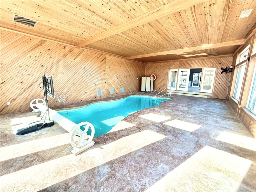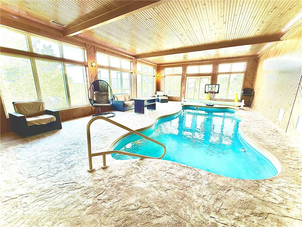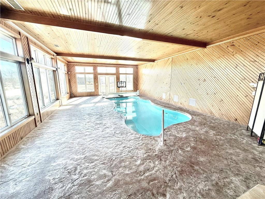 Stunning Ranch Home with Indoor Pool on 2 Acres! Welcome to your own private retreat! This remarkable ranch-style home offers over 4,000 sq. ft. of living space and feels like a vacation every day. Nestled on a beautiful 2-acre lot in a peaceful cul-de-sac on the edge of town, this 4-bedroom, 3-bathroom home is packed with features you’ll love. Step inside to find a spacious and open floor plan featuring a large kitchen with abundant cabinetry and counter space — perfect for entertaining or family gatherings. The oversized great room boasts a cozy gas fireplace and overlooks the impressive indoor pool, which is surrounded by floor-to-ceiling windows offering year-round enjoyment and picturesque views. The luxurious primary suite includes a generous bedroom, large walk-in closet, and spa-like bath with a tiled walk-in shower and double sinks. Additional main-floor highlights include a designated home office with built-in shelving and a convenient laundry room. The finished basement offers even more space to relax and entertain, including a large bonus room, a family/movie room with a built-in bar area, and plenty of storage. Car enthusiasts and hobbyists will appreciate the four-car garage setup: A third bay designed for RV parking A fourth garage perfect for storage or workshop use Enjoy outdoor living with the expansive stamped concrete patio and mature landscaping. This home truly has it all — space, style, function, and a one-of-a-kind indoor pool experience. Don’t miss this rare opportunity to own a home that checks every box!
