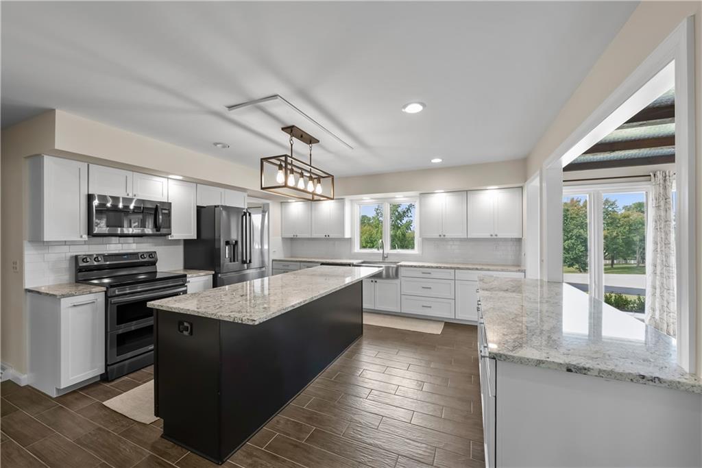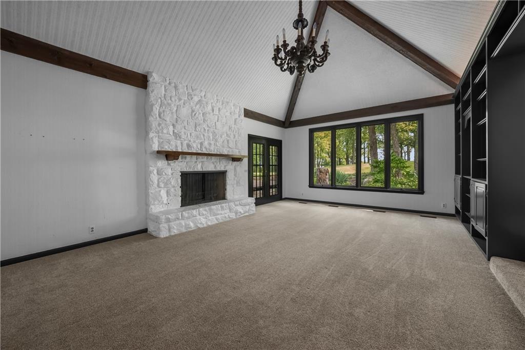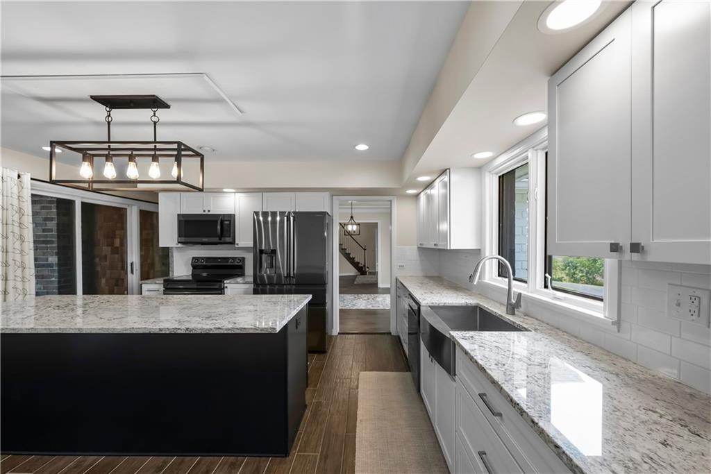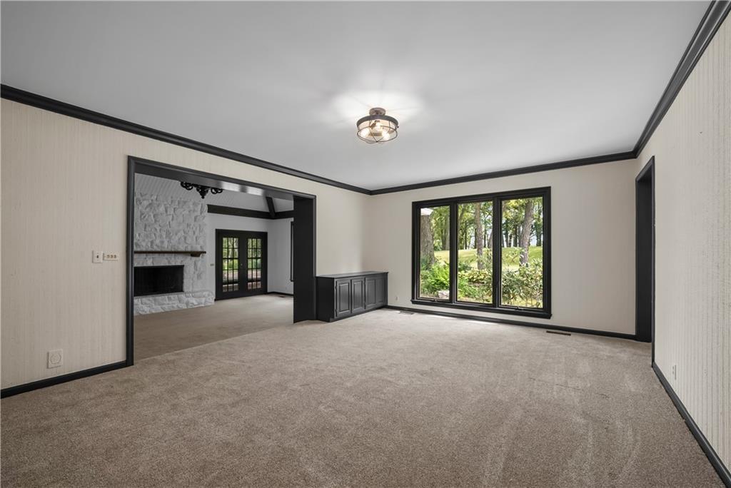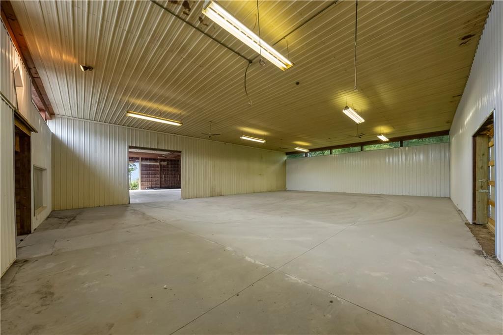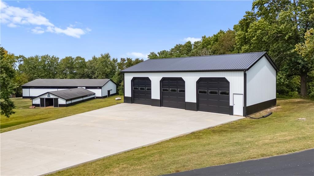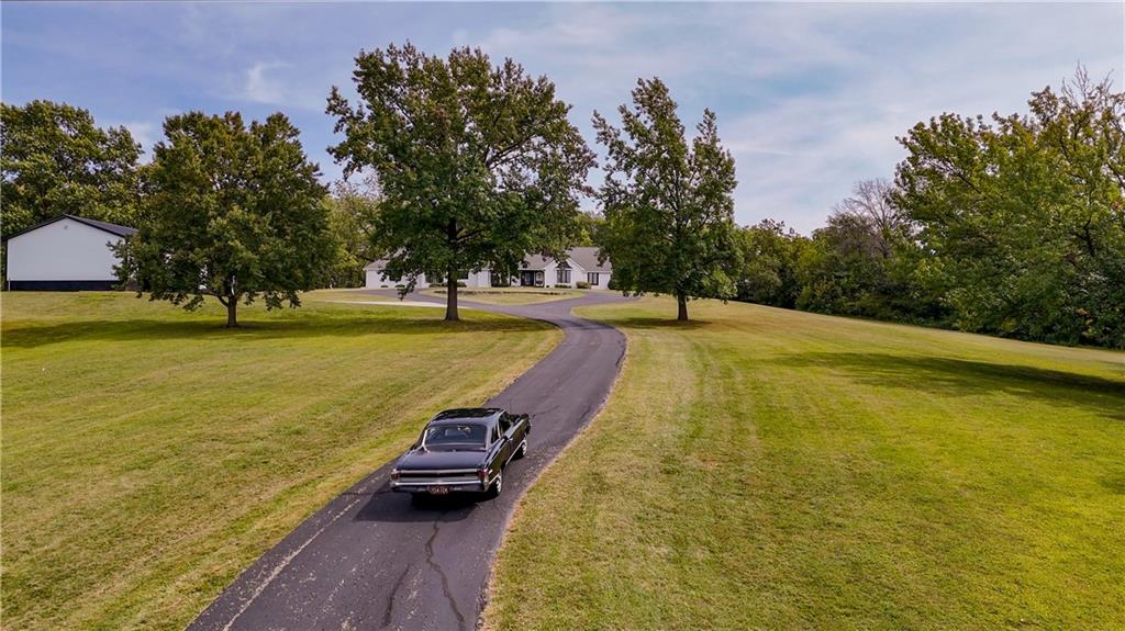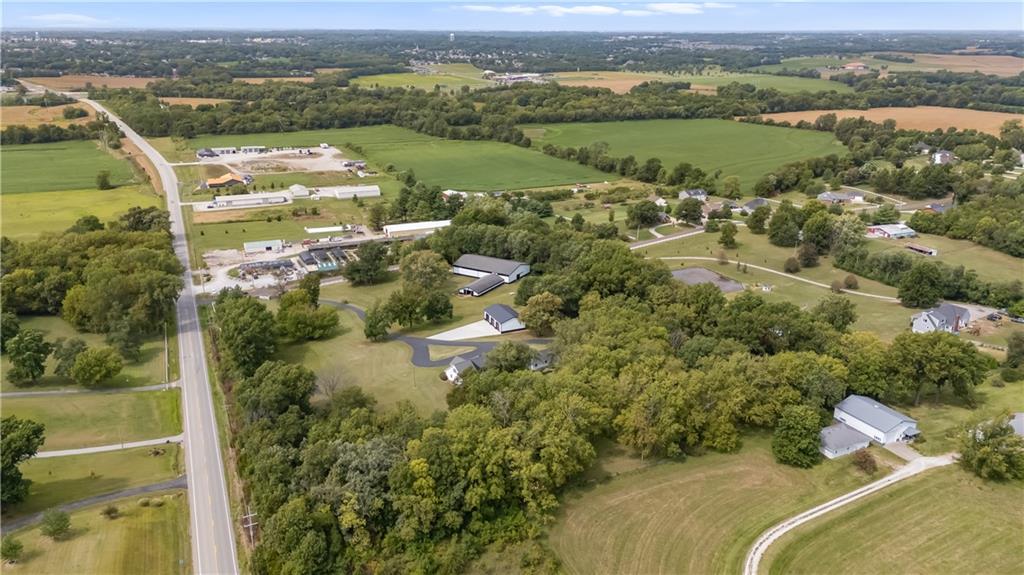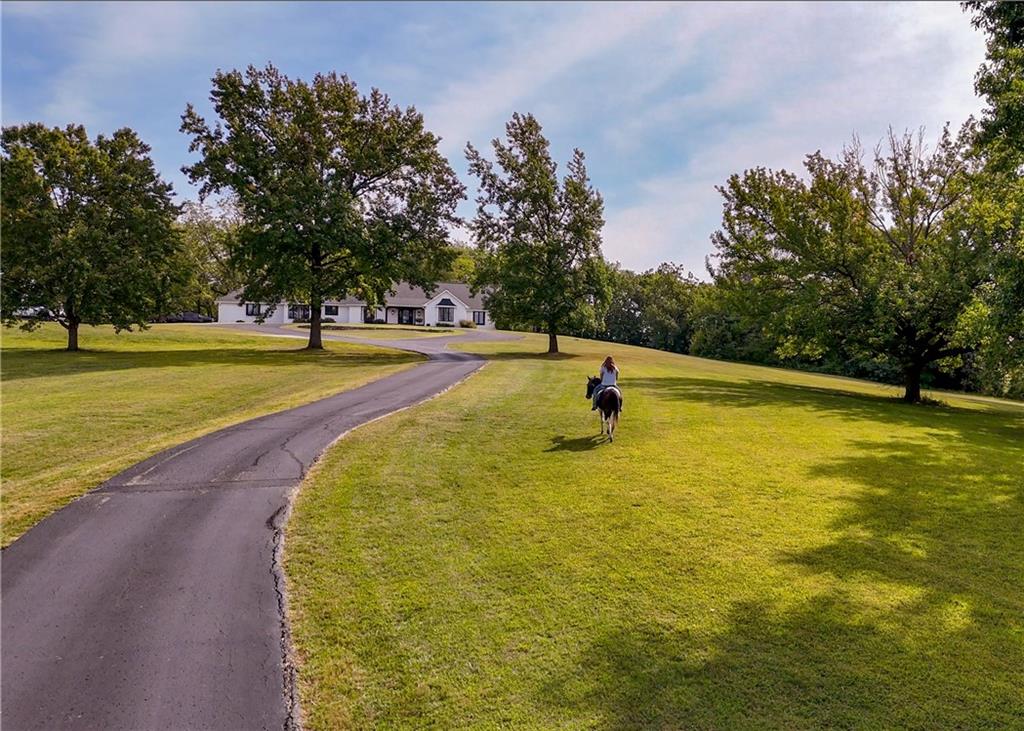 Experience unparalleled privacy and luxury on this 10.7-acre gated estate. This 5-bedroom, 4 full & 2 half bath residence offers 5,299 sq. ft. of finished living space, blending modern updates with timeless character. A grand foyer with a sweeping staircase welcomes you into multiple living and entertaining spaces, including formal living and dining rooms, family room, screened-in porch, and main floor laundry. The centerpiece of the home is the completely renovated gourmet kitchen, featuring quartz countertops, stainless steel appliances, and custom cabinetry. The primary suite features an updated ensuite bath with dual vanities and his-and-hers walk-in closets. While refreshed throughout, the home still retains its original charm with stained glass accents, crystal door knobs, and millwork adding character throughout. The grounds extend far beyond the residence, with a brand new detached 3-car garage with oversized 14’ doors, ideal for RVs, boats, a car collection or workshop in addition to the attached 3-car garage. THE GAME CHANGER: An expansive 11,000+ sq. ft. outbuilding unlocks countless opportunities with 12 horse stalls, tack and feed rooms, water, electric, and concrete floors. Perfect for equestrian use, car collectors, workshops, event venues, business owners or hobby farmers. Located just minutes from town and a short drive to Kansas City or KCI Airport, this ridge-top retreat offers panoramic views of nature's beauty along with peace and privacy.