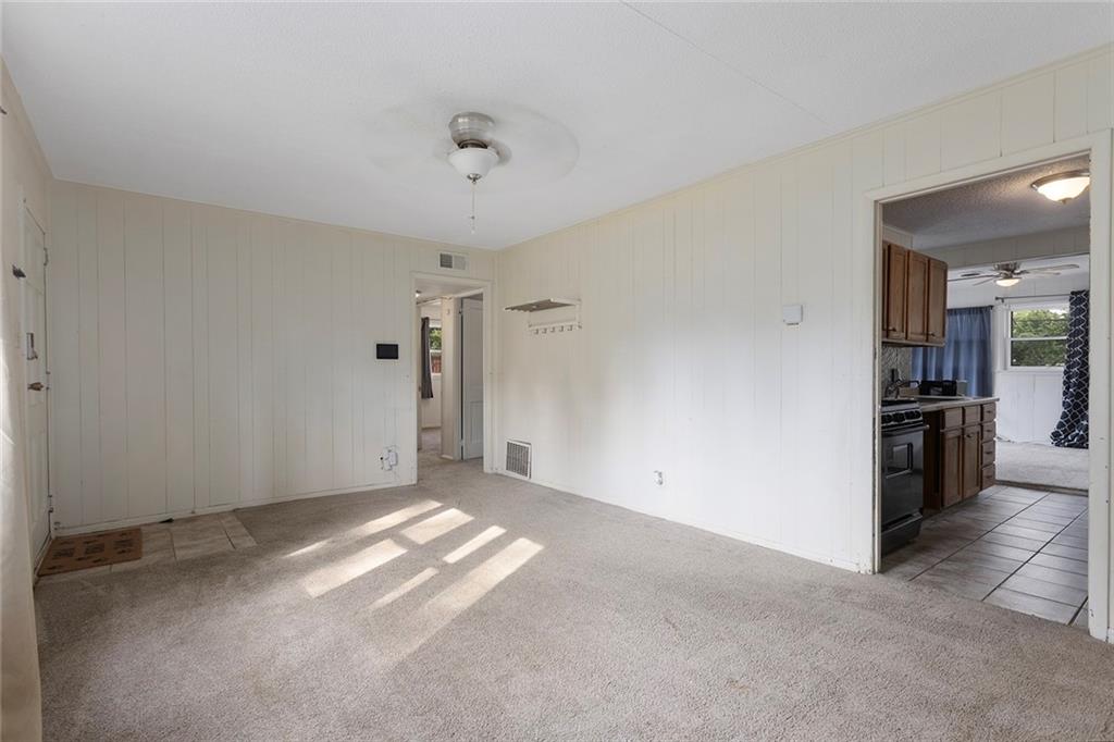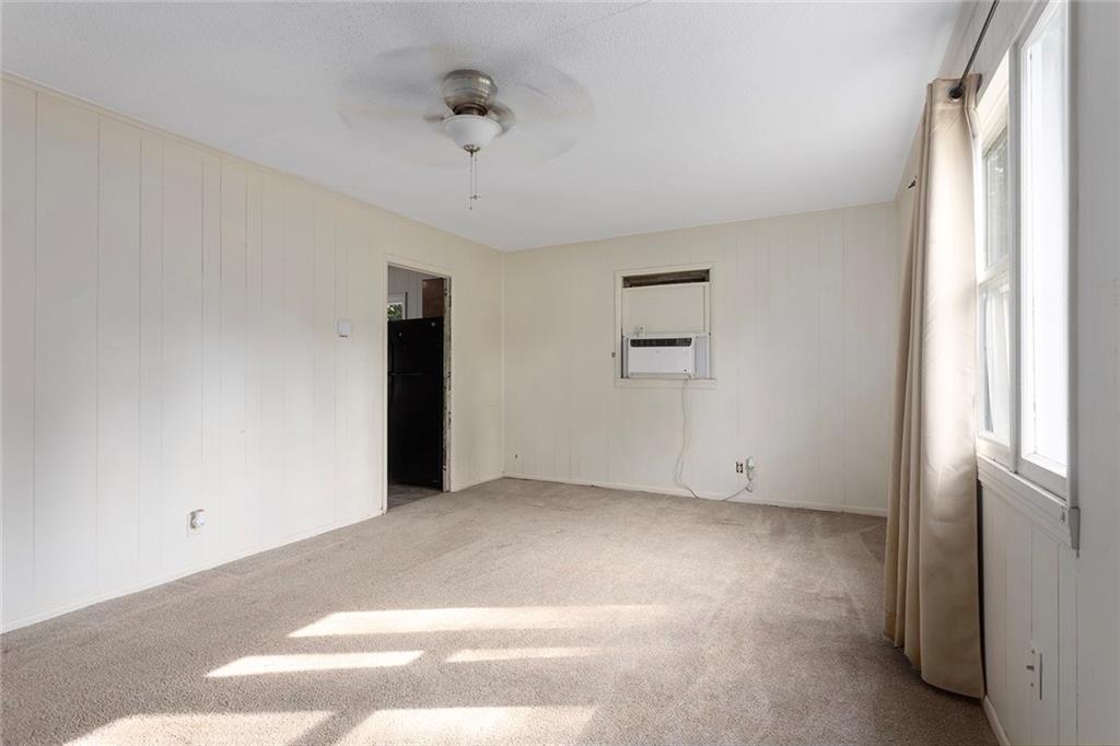 Empty room featuring light colored carpet, wooden walls, and a ceiling fan