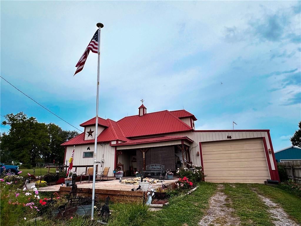 Relax on the deck on the front of this property and watch the sunset over the gently rolling county hills. Inside you will find a 3 bedroom, 1 full bath older remodeled home in the small country town of Fairport in Dekalb county. This home sits on 1.3 acres and the vacant lot of .37 acres to the north -also sells with the property. Inside you will find an older updated rustic, country feel with the primary bedroom downstairs and 2 bedrooms upstairs with a bonus room in the middle. The main level you will enjoy the kitchen, dining room, full bath, laundry room and another bonus room off the living room, great for a small office. From the kitchen walk out onto a large deck, it does need some replacement (deck), it leads to the large drive through garage and they used the small building on the deck as a summer kitchen where they canned foods in season. Looking off the back deck, they had horses on the property and several outbuildings to accommodate them. 3 wells are on the property as well as 220 electricity for camper hookups. It is a great retreat for the hunter and fisherman as work stations are located throughout the property. New HVAC and hot water heater earlier 2025. Appliances stay and are newer also. Garage is tall enough to pull a Semi into it. Property is selling As Is