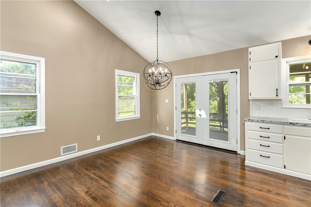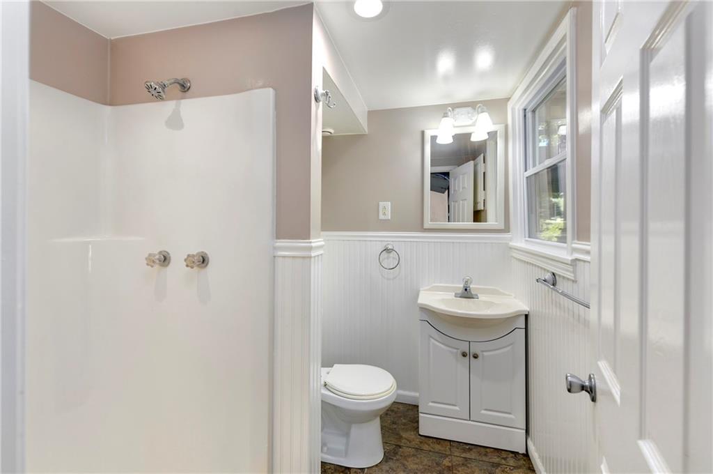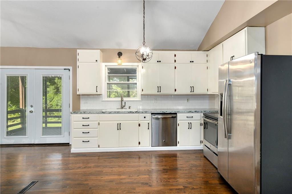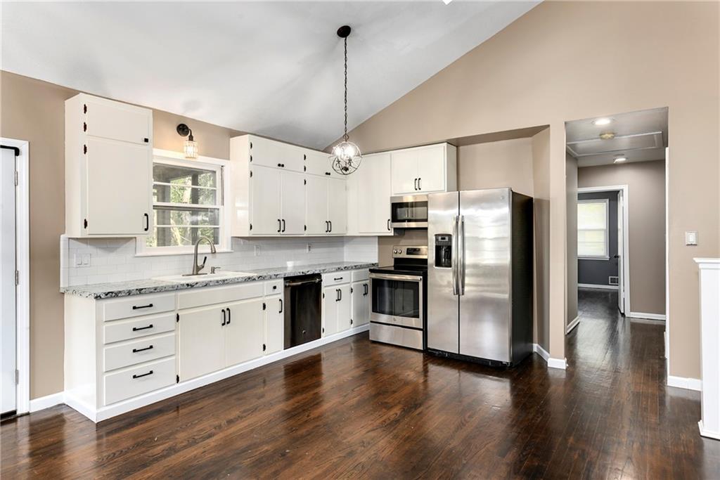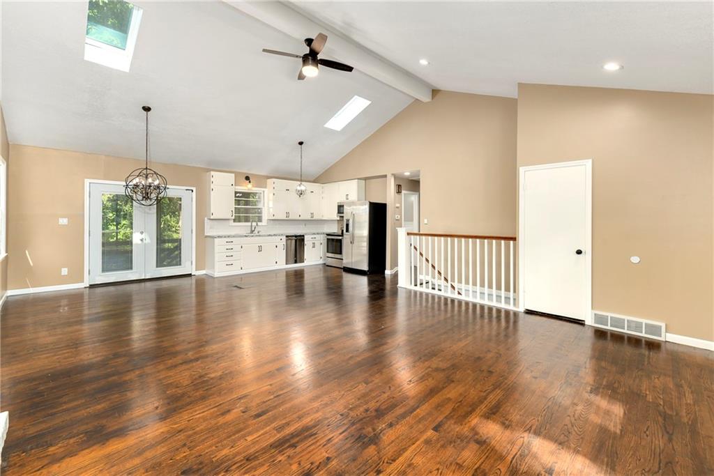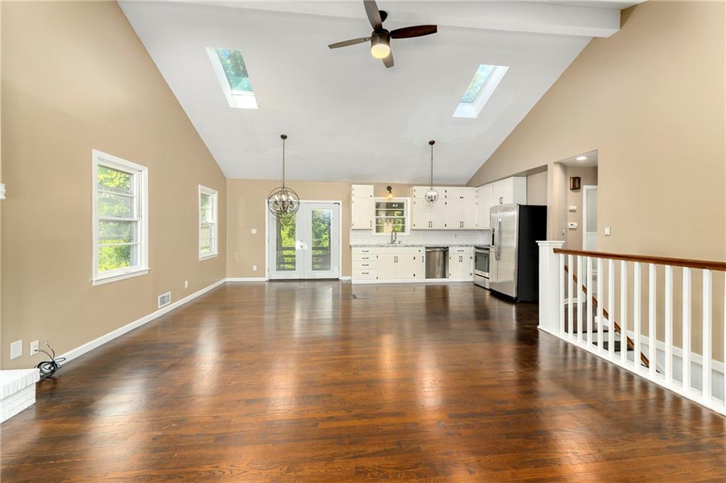 Welcome home to this beautiful ranch-style retreat tucked away on a quiet cul-de-sac! Step inside to soaring vaulted ceilings and skylights that fill the space with warm, natural light. The inviting living room centers around a striking fireplace — perfect for cozy evenings. Elegant light fixtures add a touch of sophistication to the dining area and kitchen, which also features newer stainless steel appliances and easy access to the back deck, ideal for outdoor dining or relaxing. Rich dark wood floors flow throughout the main level, where you’ll find three spacious bedrooms and a full bath. The finished walkout lower level offers incredible flexibility — perfect for a large family room, home office, or even a fourth bedroom. It also includes a second full bathroom, laundry area with cabinetry and a wash sink, and walkout access to the patio and backyard. Additional highlights include a radon mitigation system, a rear-entry garage, and a brand-new extended asphalt driveway providing plenty of parking space. This home combines comfort, style, and functionality — ready for its next owner to make it their own.