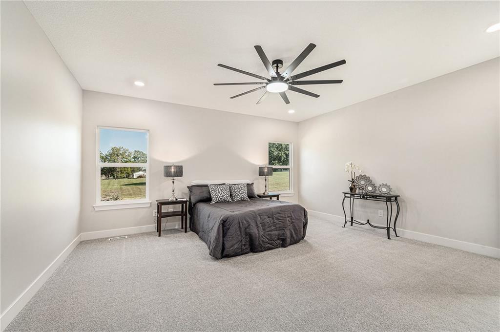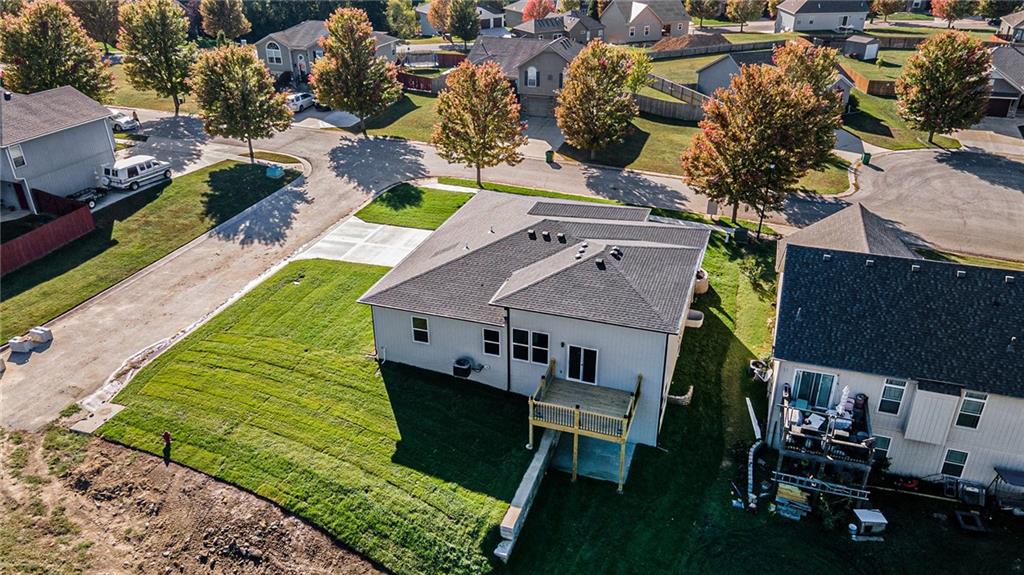 Built by two trusted Kansas City builders with 50 + years of combined experience, this handcrafted Reverse 1.5-story home showcases quality you can see and feel. Step through the 8-foot front door into a soaring great room with floor-to-ceiling windows, modern electric fireplace, and open flow to a chef’s kitchen featuring custom wood cabinetry, quartz counter tops, tile backslash, and premium KitchenAid + Frigidaire appliances. The main level offers two spacious bedrooms, each with its own full ensuite bath — perfect for guests or a home office. The spa-inspired primary suite includes a double-vanity bath, standalone soaking tub, and dual walk-in closets. Downstairs, a finished walk-out basement expands your living space with two additional bedrooms joined by a stylish Jack-and-Jill bath, a generous recreation area, and a convenient half bath for entertaining. Total of 4 beds | 4.5 baths | ~2,927 sq ft of finished comfort. Built for efficiency and durability with a Hi-Efficiency furnace, tankless water heater, and energy-smart windows. Outdoor living shines with a deck overlooking the private backyard that backs to green-space. Located just minutes from I-435, The Legends, parks, and schools — enjoy quiet suburban living with easy city access.