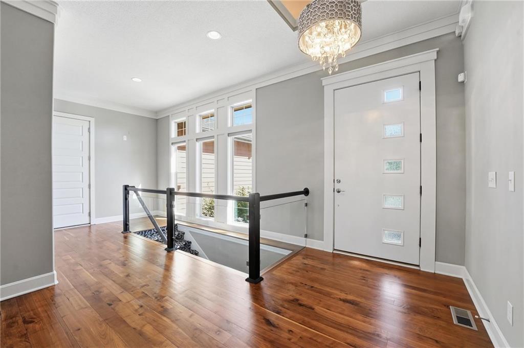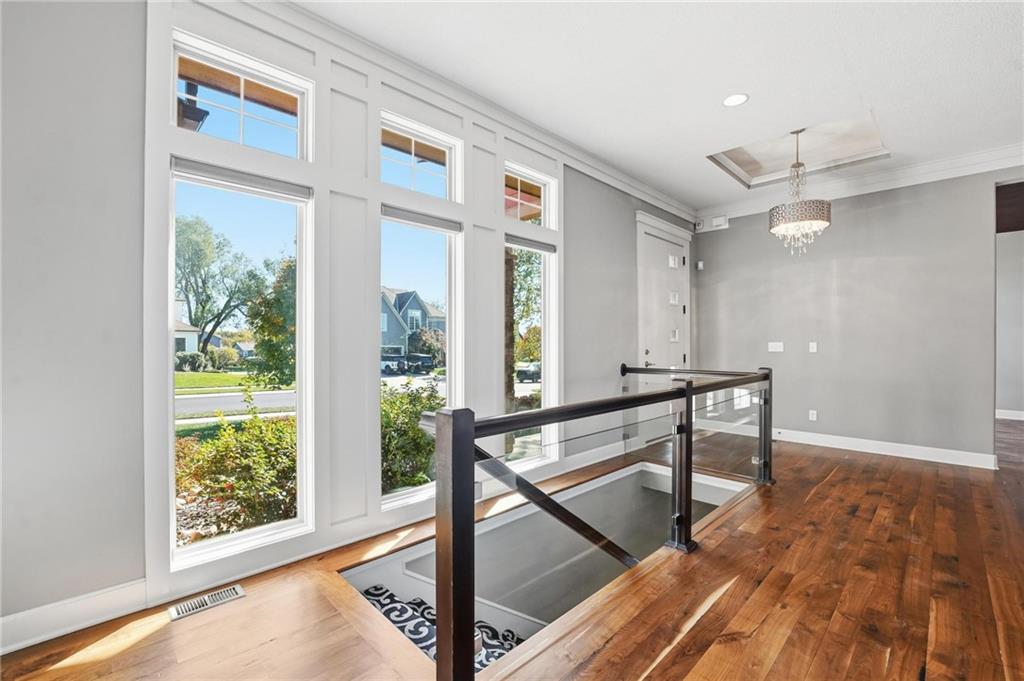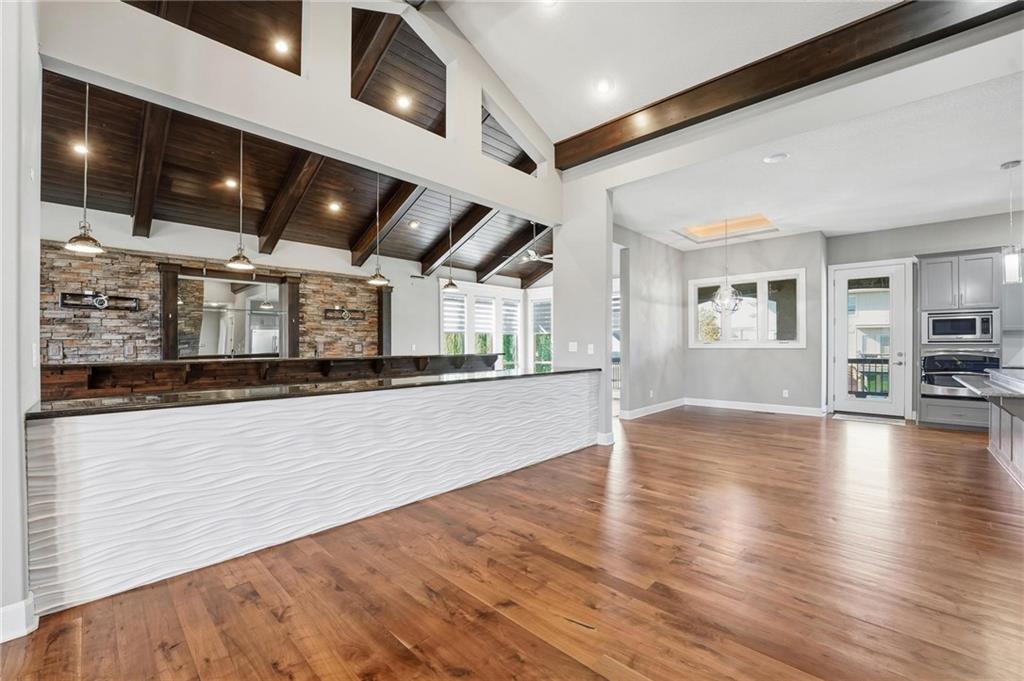 Exceptional custom home designed with entertaining in mind. Stunning walnut floors from the gracious entry, through the great room, kitchen & breakfast room. Great room has vaulted ceiling, gas fireplace in stone accent wall, built-ins & floating shelves. Kitchen has large island, top of the line appliances including built-in Frigidaire Professional refrigerator/freezer, cooktop with vented hood, dbl oven, microwave & dishwasher. Pantry is 5x16 with built in desk under window, tons of shelf space. Breakfast nook is ideal for banquet, full glass door out to Lanai, vaulted ceiling, ceiling fan. Bonus main level family room has 19' bar w/custom cabinets, granite counters, stone walls behind bar, 2nd 15' long serving bar with tons of storage, granite countertop & mid century design. Family room has 15' vaulted ceiling with tongue & groove ceiling & beams. A beautiful den space, or room for baby grand piano, under the beautiful fixture plus additional dining space surrounded by windows & door out to large covered Lanai with tile floor. The primary suite is large with vaulted ceiling & luxury bath with separate vanities, very large tiled shower, dream 10x18 walk-in closet with large dresser island, walks through to laundry. Staircase to lower level with custom glass panel railing, large windows flooding the stairway with natural light. Large family room with wet bar area with tiled floor. 1 guest suite with bath & large walk-in closet, 2 additional bedrooms have walk-in closets, each with private vanity spaces, share shower. 1 bedroom has a secret passageway through built-in bookcase, to 8x9 storm area/storage under front porch! New covered patio off lower level family room is 20x13. Car lovers, a bonus 4th garage, has driveway from main level, is 22'd x 19'w. The main level 3 car garage is oversized, 31'wide, with 11' ceiling, 2 car side is 24'deep, 1 car side 29'deep with 9' wide door. North Shore is Cass County, Lee's Summit Schools.