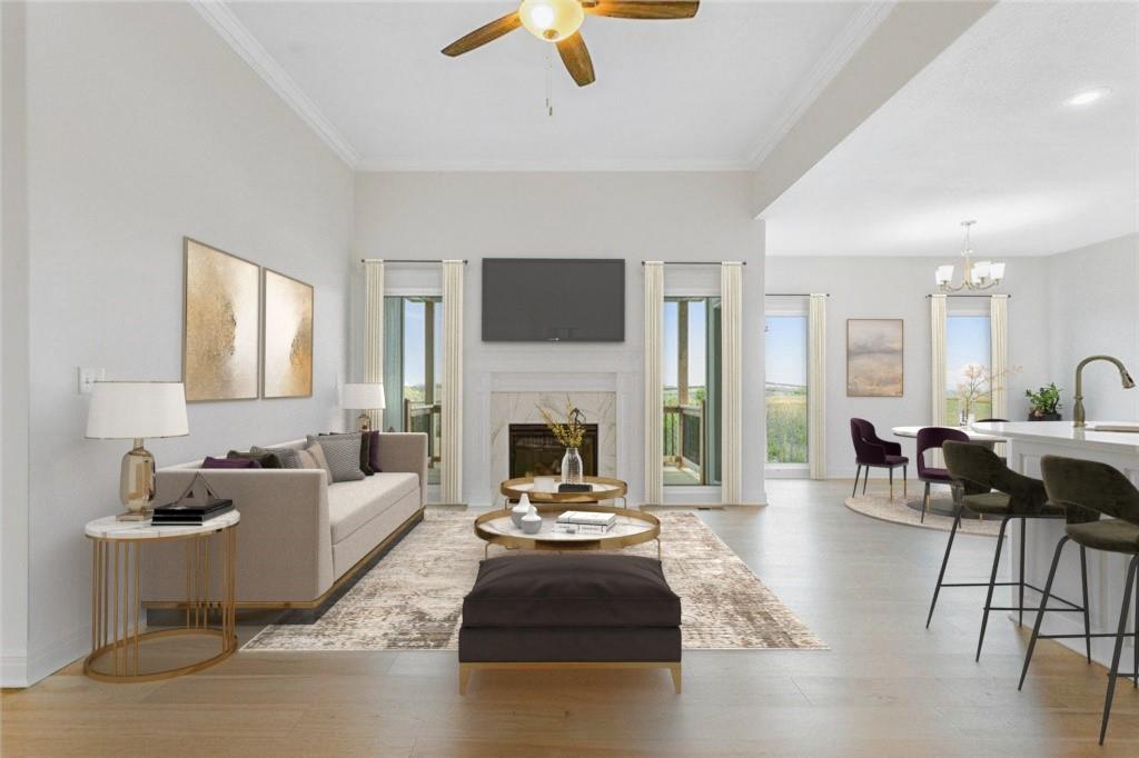 The Cameron Plan offers bright, comfortable main-level living with an open layout designed to feel inviting the moment you walk in. The primary suite feels like a true retreat with its spacious walk-in shower and generous closet. Quality construction keeps the home quiet and comfortable, while details like hardwood floors, under-cabinet lighting, comfort-height vanities, a covered deck, and a walkout patio make everyday living feel elevated. This community offers a low-maintenance lifestyle with lawn care, landscaping, snow removal, and sprinkler system upkeep included, giving you more time to enjoy your home rather than maintain it. A neighborhood dog park is planned for 2026, adding even more to look forward to. Quick access to major high ways and move-in ready, this home is designed for easy living.