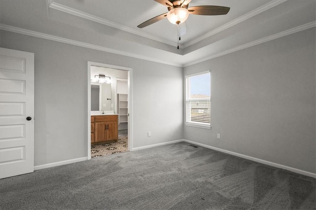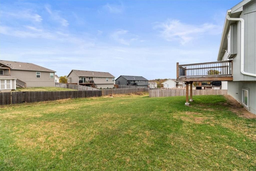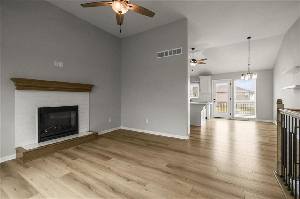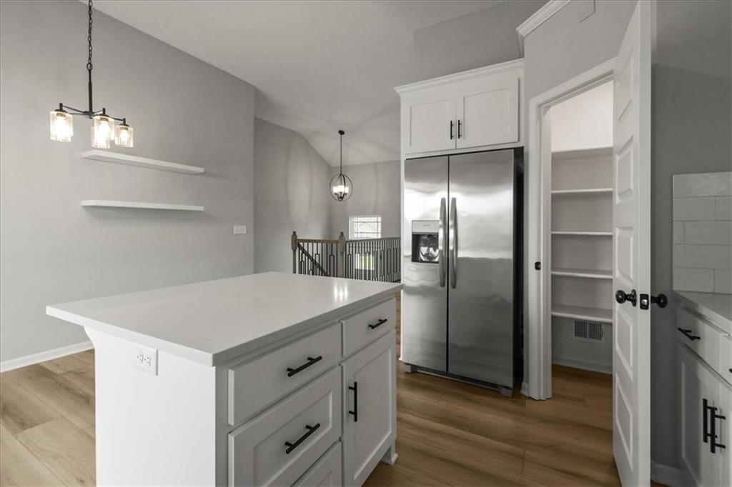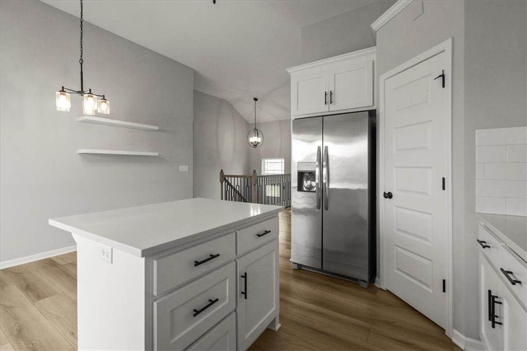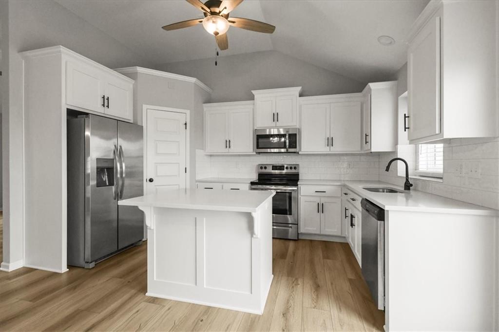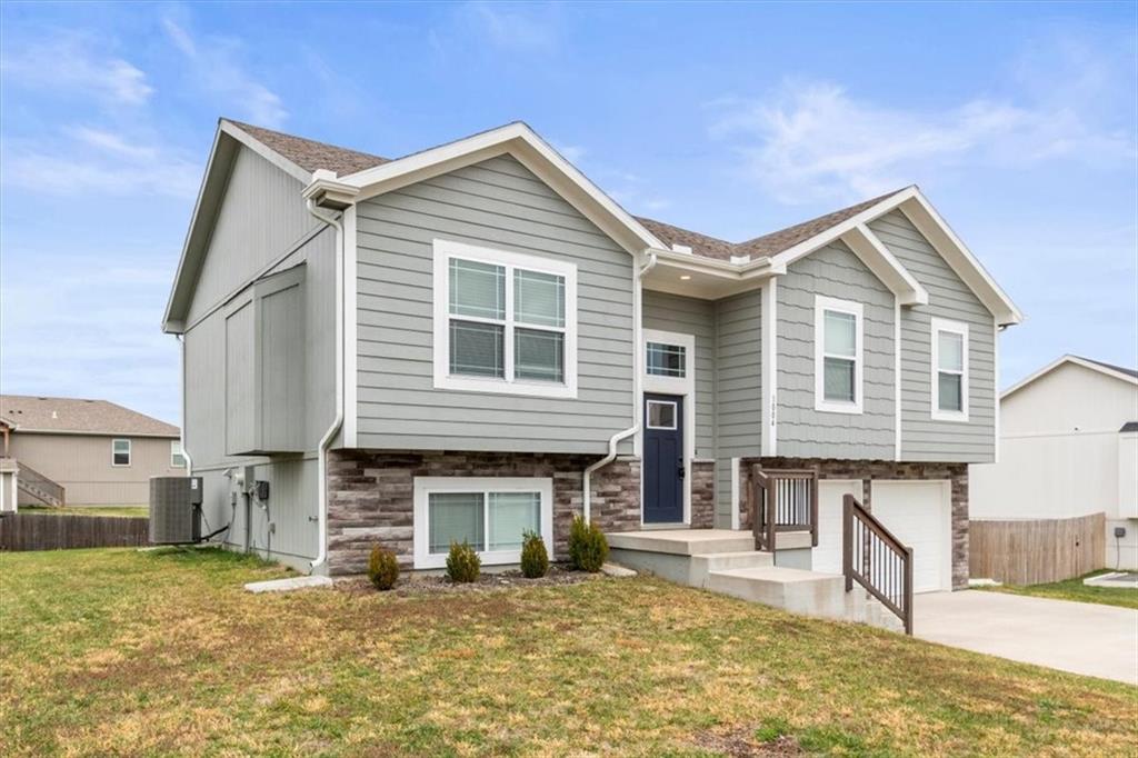 Prepare to fall in love with this almost-new construction, split-level home in the desirable North Creek community of Oak Grove! Designed with an inviting and calm aesthetic, this property perfectly blends modern features with cozy, livable spaces. It's ready for you to move in and start making memories! The architectural style creates a wonderful separation between living areas while maintaining an open, airy feel thanks to the vaulted ceilings and open-concept layout between the kitchen and living room. The gourmet kitchen is truly the heart of the home, featuring sparkling white cabinetry, a large center island with a crisp white quartz-style countertop, a full suite of stainless steel appliances, and a chic subway tile backsplash. The main living area is highlighted by a stunning, vaulted ceiling and a beautiful fireplace framed by white subway tile and a rustic wood mantle—perfect for gathering on chilly evenings. Your private primary suite is a luxurious retreat, featuring a tray ceiling and soft, neutral-toned carpet. The ensuite bathroom is a showstopper with a double-sink wood-toned vanity, contemporary light fixtures, and eye-catching patterned tile flooring. The attached walk-in closet offers smart organization with built-in shelving and ample hanging space. You'll appreciate the continuous, premium hard-surface flooring throughout the main floor living areas for easy maintenance and a cohesive look, complemented by sleek black hardware on cabinets and doors for a bold, contemporary contrast. The staircase, featuring modern black wrought iron balusters, connects the levels with style. The finished lower level provides excellent bonus space for a second family room, home office, or play area, complete with large windows for natural light. The exterior offers great curb appeal with charming gray-blue siding, white trim, a stone-accented front, and a two-car garage. This home is truly a special find—a perfect blend of style, comfort, and functionality.