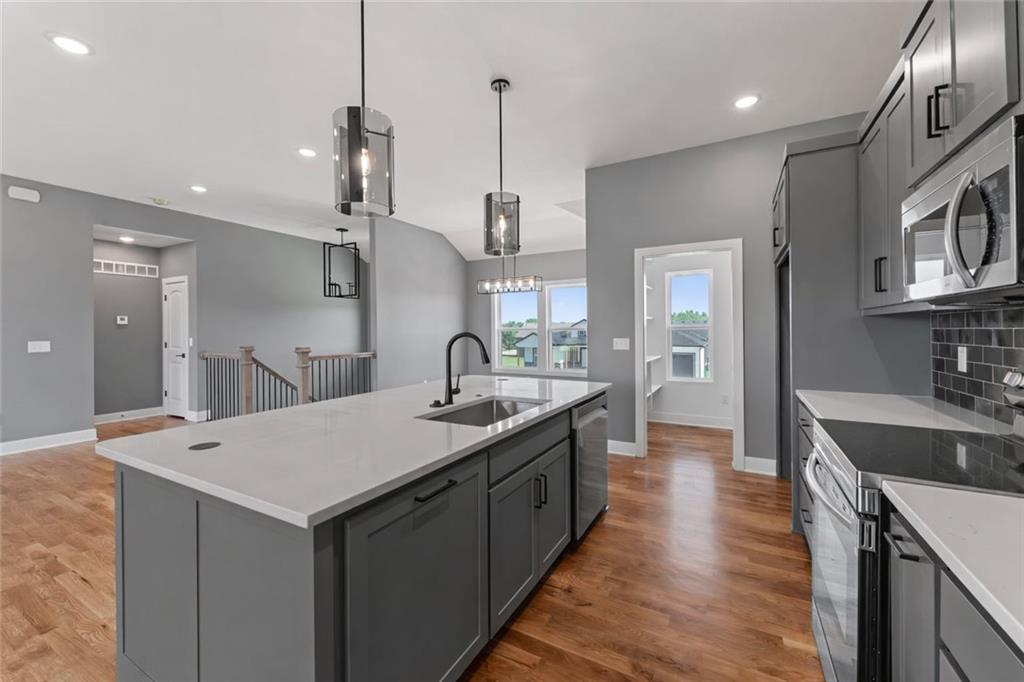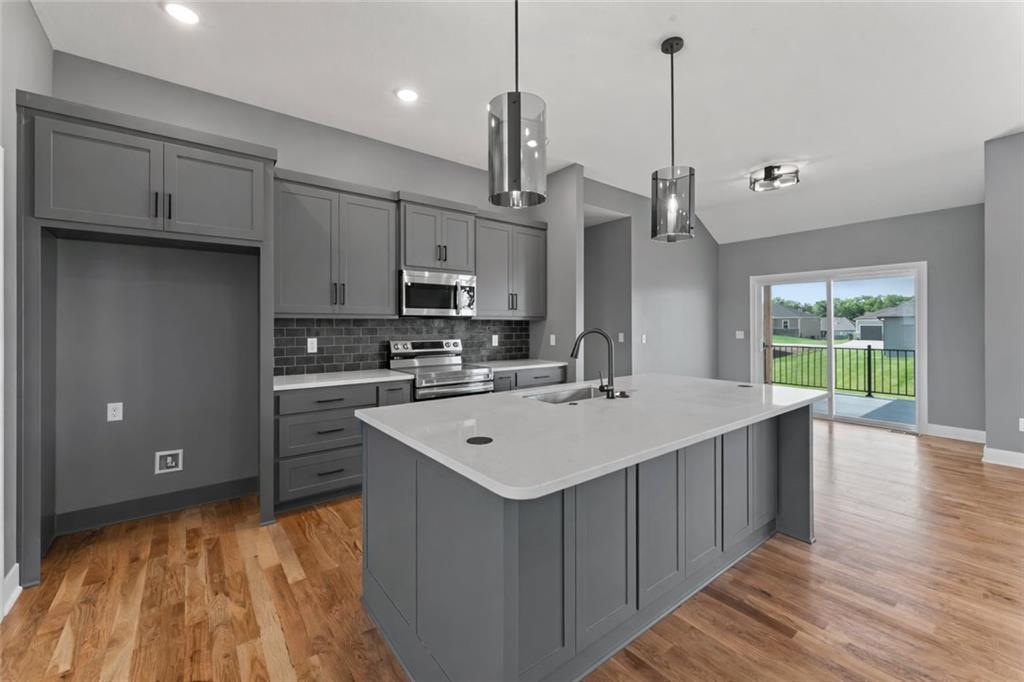 This new split-entry home is the last brand-new home available in Bedford Downs. Currently scheduled for completion at the end of February, buyers still have time to select paint colors, offering a chance to personalize a new construction home before completion. The open main level features a bright, functional layout with a spacious kitchen offering quartz countertops, a center island with bar seating, pendant lighting, custom soft-close cabinetry, tile backsplash, and a walk-in pantry. The sunlit breakfast room opens to a covered deck, ideal for outdoor dining or relaxing. A separate dining area provides additional space for gatherings. The great room includes tall windows, recessed lighting, and a ceiling fan, creating a warm and inviting living space. The primary suite features a vaulted ceiling, walk-in shower, dual vanities, a large walk-in closet, recessed lighting, and a ceiling fan. Two additional bedrooms are located on the opposite side of the home for added privacy, each with a ceiling fan. The walk-out lower level (optional finish) can include a spacious rec room, fourth bedroom, and third full bath, along with large windows and access to a covered patio. A three-car garage with openers completes the home. Finished photos are of the same floor plan completed earlier this year. Priced at $393,900, with optional lower-level finish packages available: • Rec Room + Full Bath: $409,900 • 4th Bedroom + Rec Room + Full Bath: $414,900 This home also qualifies for zero-down financing, making new construction more accessible than ever. Contact the listing agent for full details.