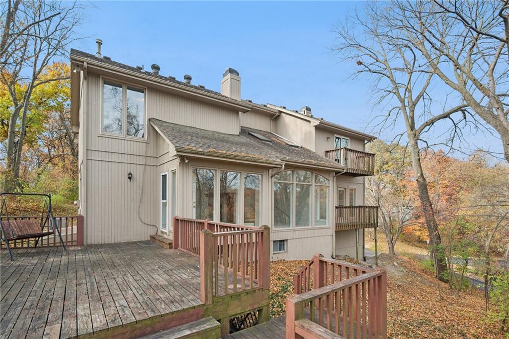 Custom-built home by current owners new to the market! Another beautiful, architectural designed Bluffs home nestled into a hill-top treehouse canopy! Gorgeous views from an abundance of tall windows throughout the home make for a stunning backdrop. Vaulted ceilings, skylights and a catwalk view from the second floor add light and airiness to the home's floorplan. First floor is anchored by a see through fireplace between great room and cozy hearth room. Multiple dining options exist from a formal dining room to more informal breakfast room and casual kitchen island seating. Hardwood floors are found throughout the kitchen, hearth and breakfast room. Ample cabinet and counter space, plus pantry storage make for an efficient kitchen layout. Just off of the kitchen is access to a large back deck for private outdoor gatherings and relaxation surrounded by trees. Also, on the main level is the LARGE primary bedroom and primary bath complete with a see-through fireplace, jacuzzi tub, separate shower, spacious double vanity, martini deck and two his and hers walk-in closets! The second floor features glass & brass railings to maximize the views to the great room and entry below. On this level, you will find bedroom 2, full bath with double sinks and vanities, and bedroom 3 which features a small deck to enjoy nature with your morning coffee or evening wine. Both bedrooms have walk-in closets--in fact, the closet space in this home is fabulous! Two additional walk-in closets are found on this level, perfect for crafts, seasonal clothes storage or holiday decorations! Need more space down the road? The unfinished basement is ample size with an egress window, tall ceilings and plumbing for a bath. The Bluffs is unique in so many ways with it's signature trees, the convenience to downtown Parkville, shops, great restaurants, English Landing Park, downtown KC and MCI airport. All within one of the state's premier school districts! Come home for the holidays!!