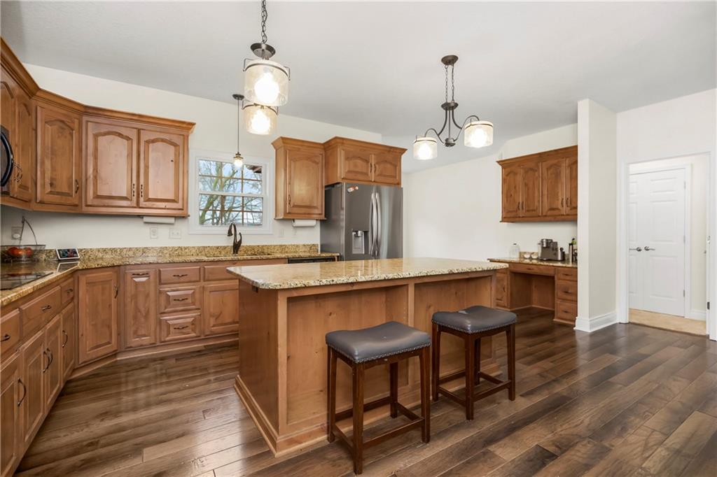 WELCOME HOME to this beautiful reverse 1.5-story home in Liberty, MO. With all-new flooring, fresh paint throughout, and thoughtful upgrades on every level, this home offers comfort, character, and exceptional livability. Step inside to a warm and inviting entryway that immediately reveals the home's spacious and well-defined layout. On the main level, you'll find a formal dining room and a cozy living room, creating a welcoming central gathering space. The left main-level wing includes the primary suite with its own private bath, a second bedroom with a full bath, and the laundry room. The right main-level ring offers the kitchen, walk-in pantry, an eat-in breakfast area, and a conveniently located half bath. Just off the kitchen, you'll find two additional bedrooms and a full bathroom. The walkout lower level is an entertainer's dream! Step into a spacious recreation area with a full bar, wine cellar, pool table, and a relaxing family room. The lower level continues with a 5th true bedroom, 4th full bathroom, and a 6th non-conforming bedroom located in the storage area where it could act as an additional room for guests, workout room, or even office. Additionally, you find a secret door that leads to a charming she-shed adding a fun and unique touch you won't find in other homes. With its generous layout, multiple functional living zones, and numerous updates throughout, this home is truly move-in ready and meticulously maintained. A rare find in Liberty, offering space, character, and upgrades at every turn.