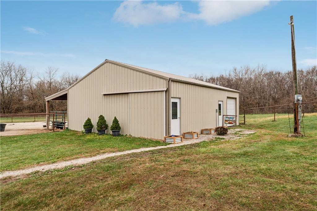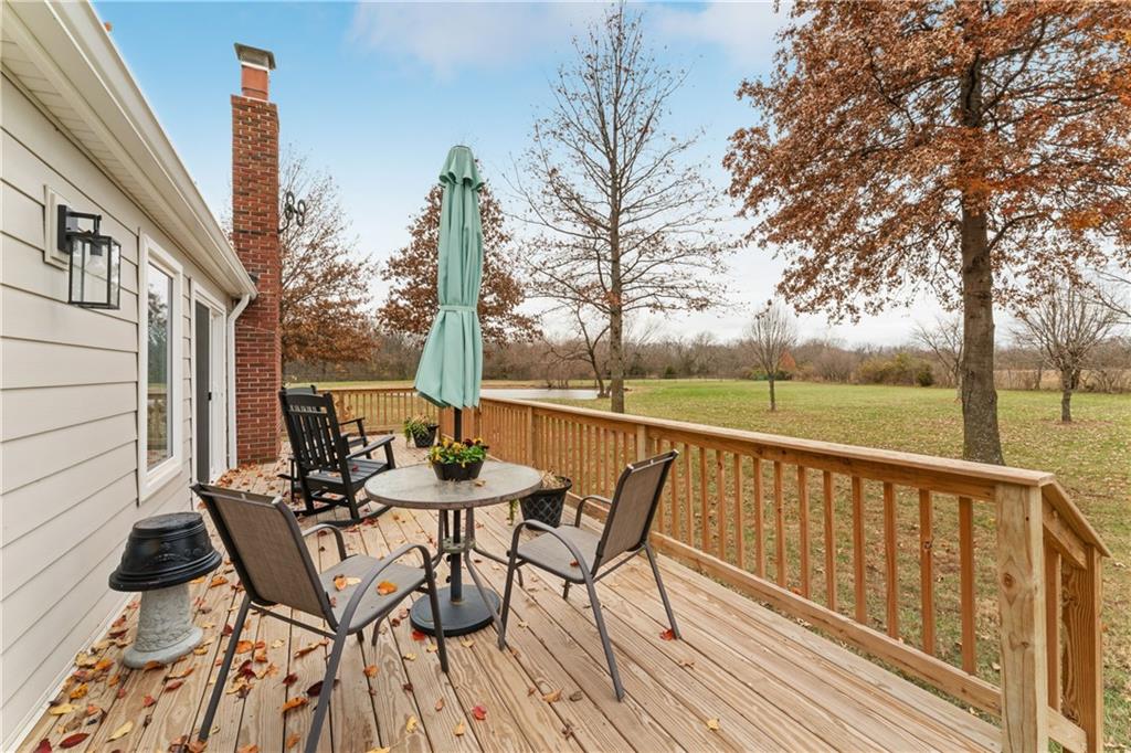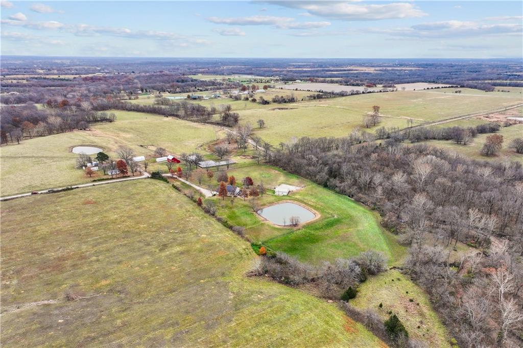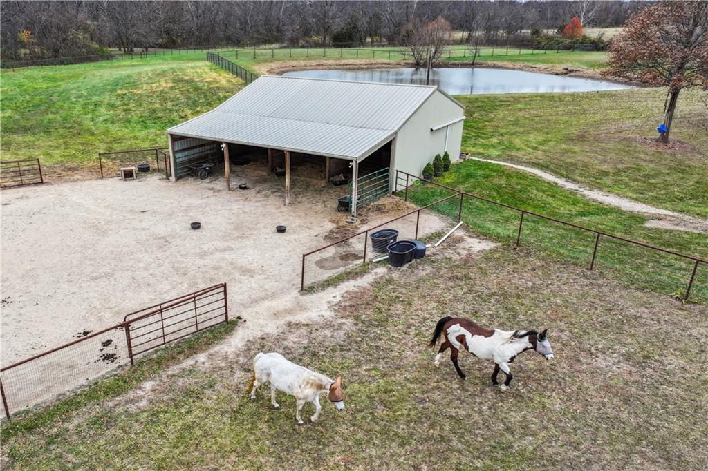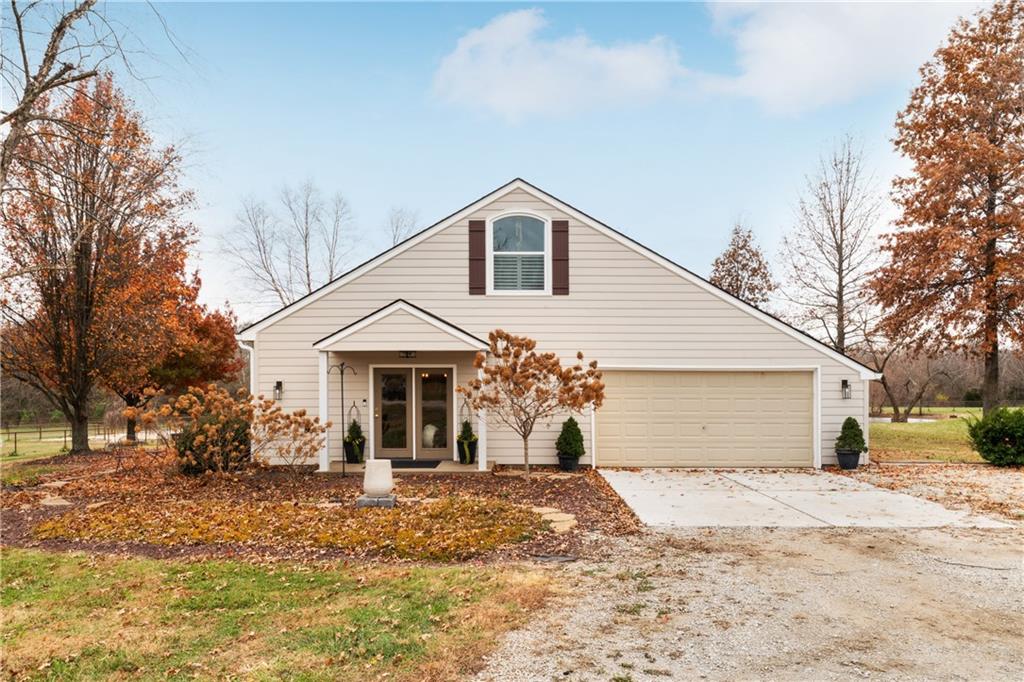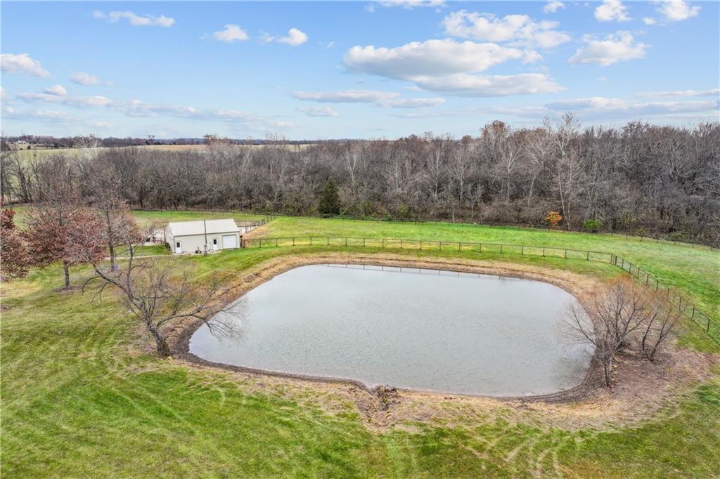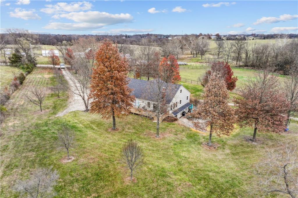 Just minutes from Overland Park and Louisburg, this 20-acre retreat offers unmatched privacy, incredible views, and a perfect blend of woods, pasture, and water. With ten acres of mature timber, ten acres of open pasture, a stocked, manicured pond, and Poney Creek running the full length of the property, it is the ideal blend of beauty and function. Horse ready and fully set up, the property includes horse safe fencing, cross fencing, a heated automatic waterer, three stalls with an attached run-in shed, a tack and storage room, plus water and electric in the barn. The home offers more than 3,100 square feet of comfortable, thoughtfully designed living space. Large windows and a brand-new deck capture sweeping views and daily wildlife. Inside, the great room is perfect for gatherings, and the kitchen is built for entertaining. Key updates give serious peace of mind. The home features 20 new thermal windows, a new sliding door, new gutters with guards, new composite siding with a 50-year transferable warranty, a one-year-old HVAC system, a one-year-old water heater, and a 5-year-old, 30-year roof. Follow the long private driveway to a property that feels secluded, peaceful, and truly special. This is a rare opportunity to live the outdoor lifestyle you want while staying close to the conveniences you need.