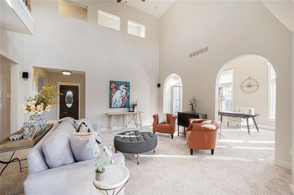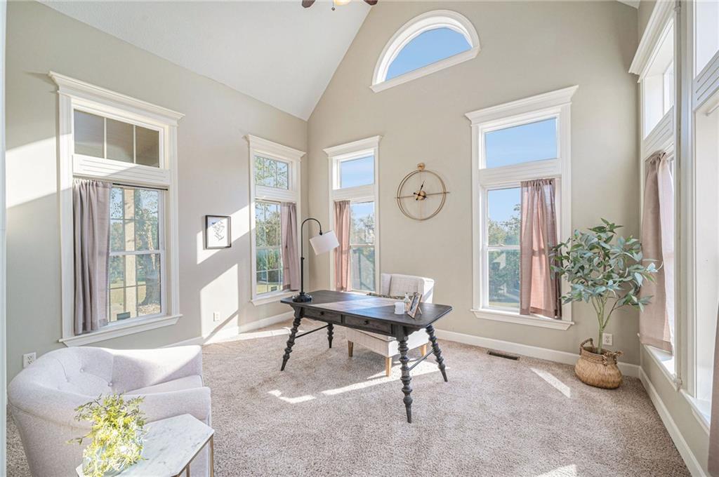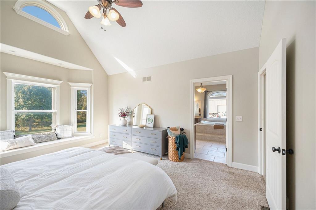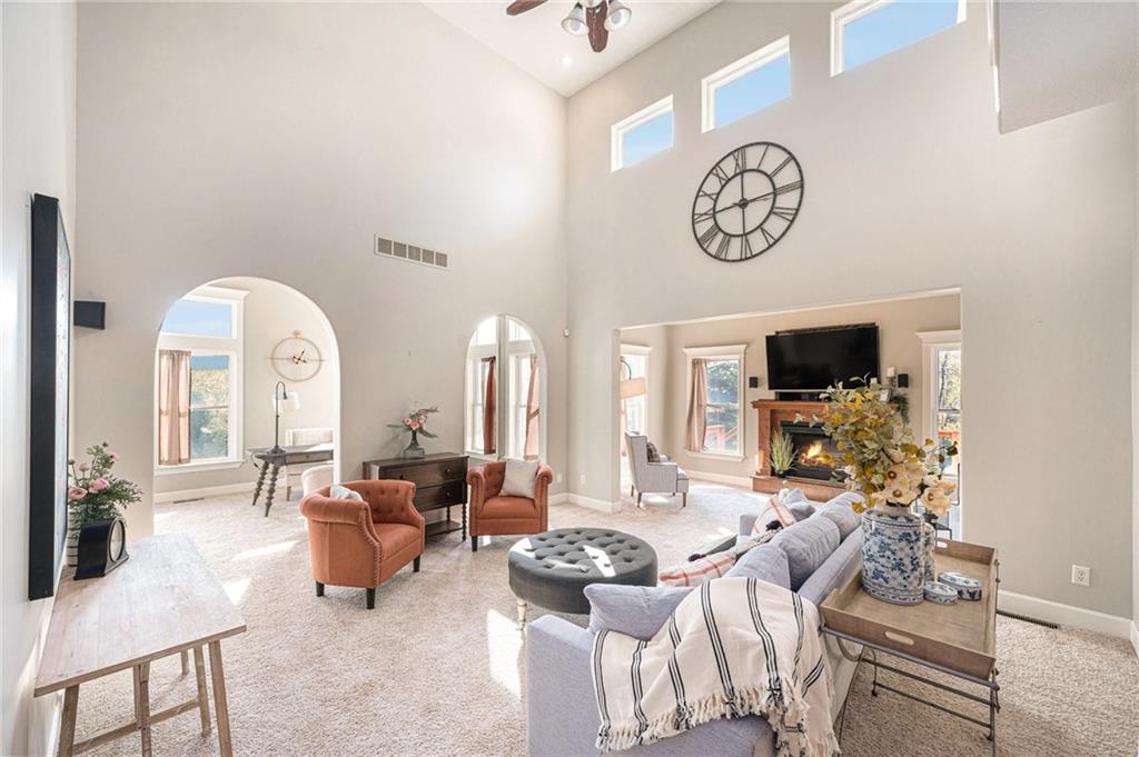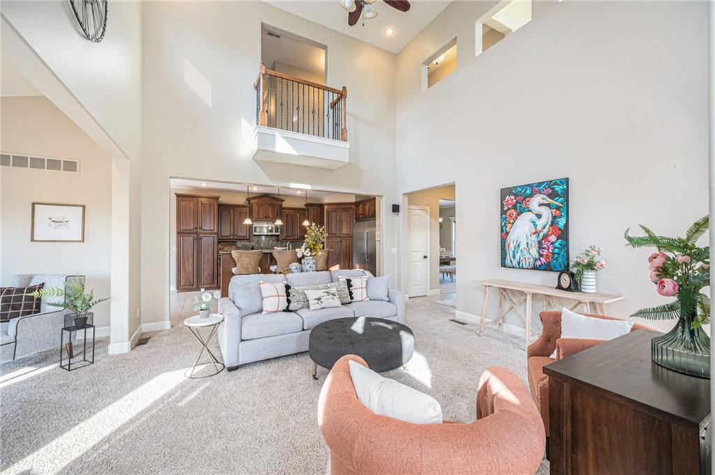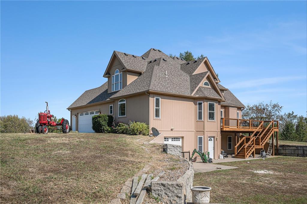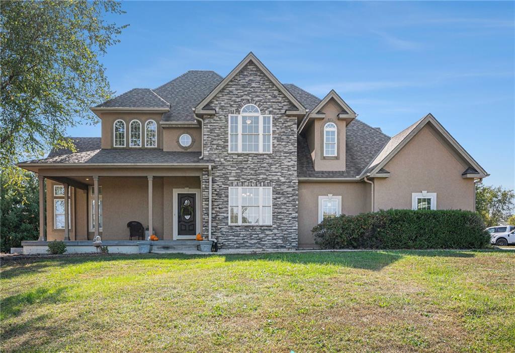 Nestled at the end of a private, scenic drive, this stunning property offers a tranquil retreat on 7.29+/- acres, boasting panoramic 360-degree views & a 70x40 outbuilding w/electricity. The charming front porch and spacious back deck are perfect for relaxing and taking in the natural beauty surrounding your dream home. Step into the foyer to discover an elegant formal dining room and a two-story living room, flooded with natural light. The cozy family room features an electric fireplace and picturesque views of the backyard, seamlessly connecting to the heart of the home – the custom designed kitchen. With beautiful cabinetry, stone countertops and backsplash, stainless steel appliances, and a walk-in pantry, the kitchen also includes a central island ideal for quick meals. The breakfast nook opens to the deck, offering easy access for outdoor dining. The den is a showstopper, with vaulted ceilings and breathtaking views from every window. The exceptional primary suite on the main level features vaulted ceilings, a bay window with a cozy bench, and a luxurious ensuite with a jacuzzi tub, dual vanities, a walk-in shower w/bench, and an expansive walk-in closet w/a dressing area. Upstairs, you'll find four generously sized bedrooms, each with walk-in closets and bathroom access. One is a potential second primary suite or guest room with a private bath. The finished walk-out lower level adds even more space, featuring a recreation room, two additional bedrooms with walk-in closets, a full bathroom, a craft or flex space, and a suspended storage area. The lower level also offers a third garage bay for added convenience. Located in the highly sought-after Kearney School District and just minutes from town, this property is a perfect blend of luxury and country living. Don’t miss your chance to own this serene escape!