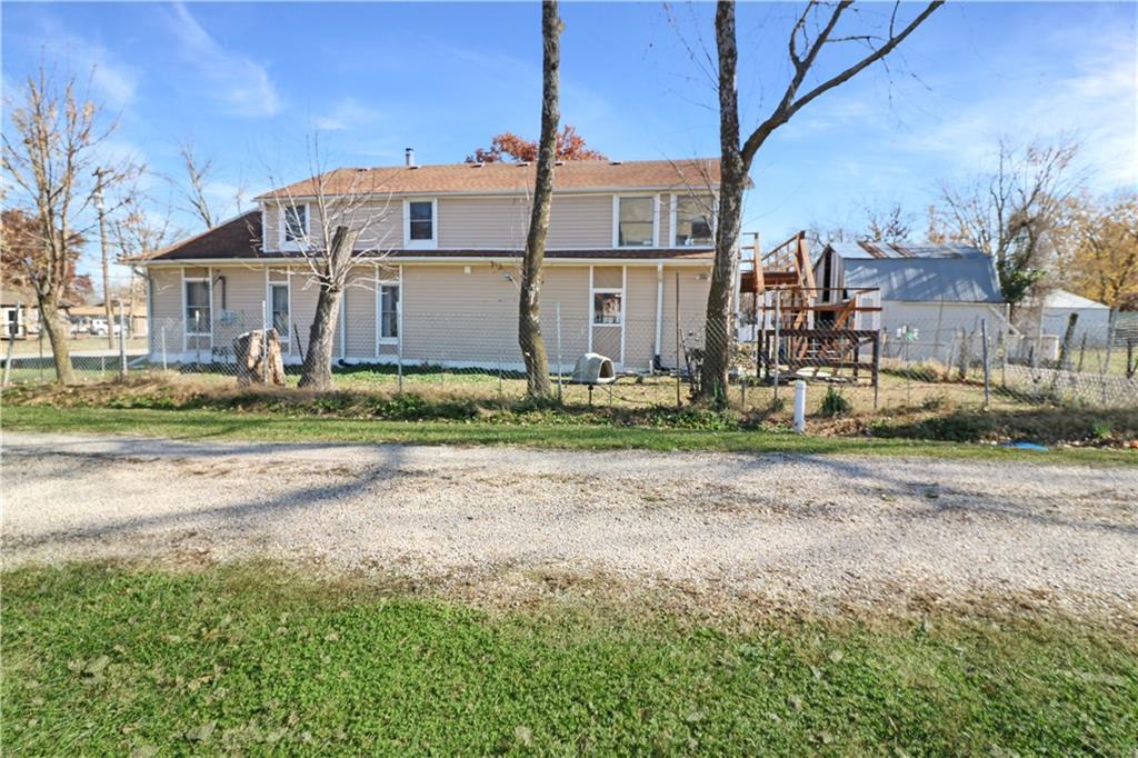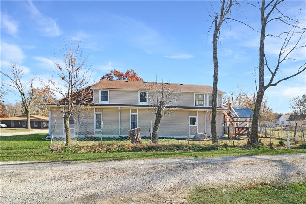 Discover an exceptional opportunity in a rural area close to Kansas City! This spacious 4-bedroom, 3-bath home sits on a large .36+/- acre lot, offering both space and seclusion. The enormous second story presents a blank canvas for an independent living suite or income-generating rental, complete with a private upper deck and ground-level stairs. The beautiful yard features mature apple and pecan trees and a partially fenced area perfect for pets or play. A versatile outbuilding provides ideal space for a workshop, extra storage, or parking. This is more than just a home; it's an investment for future income! Call today for your private showing.