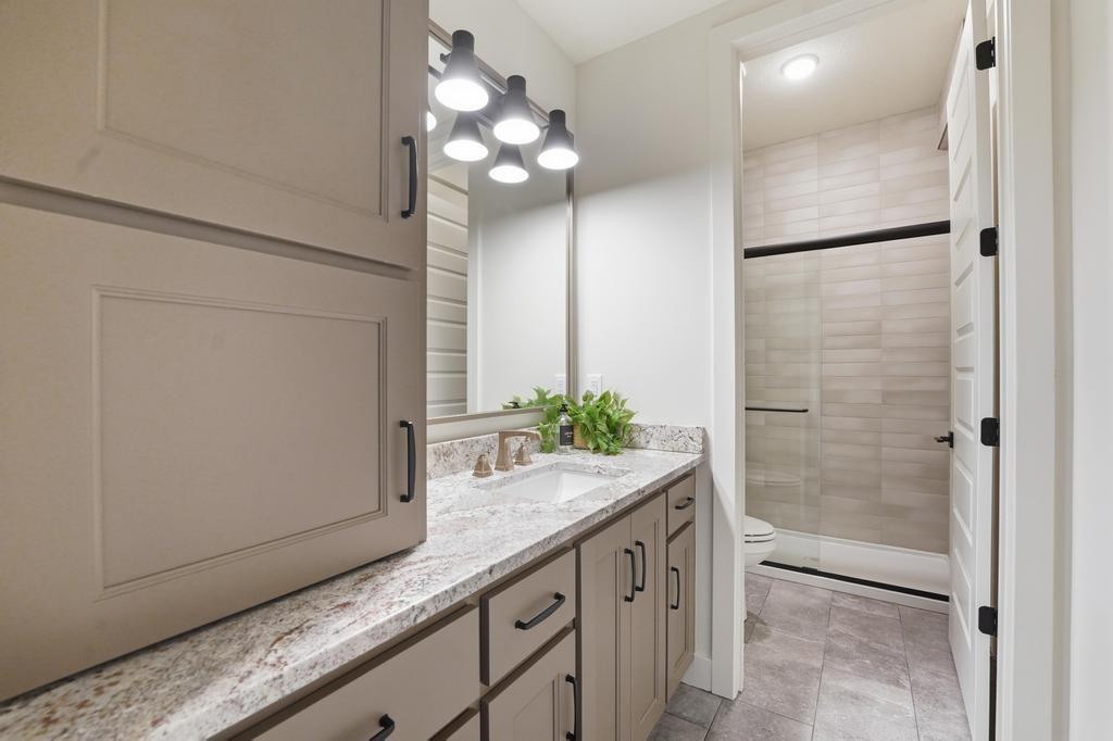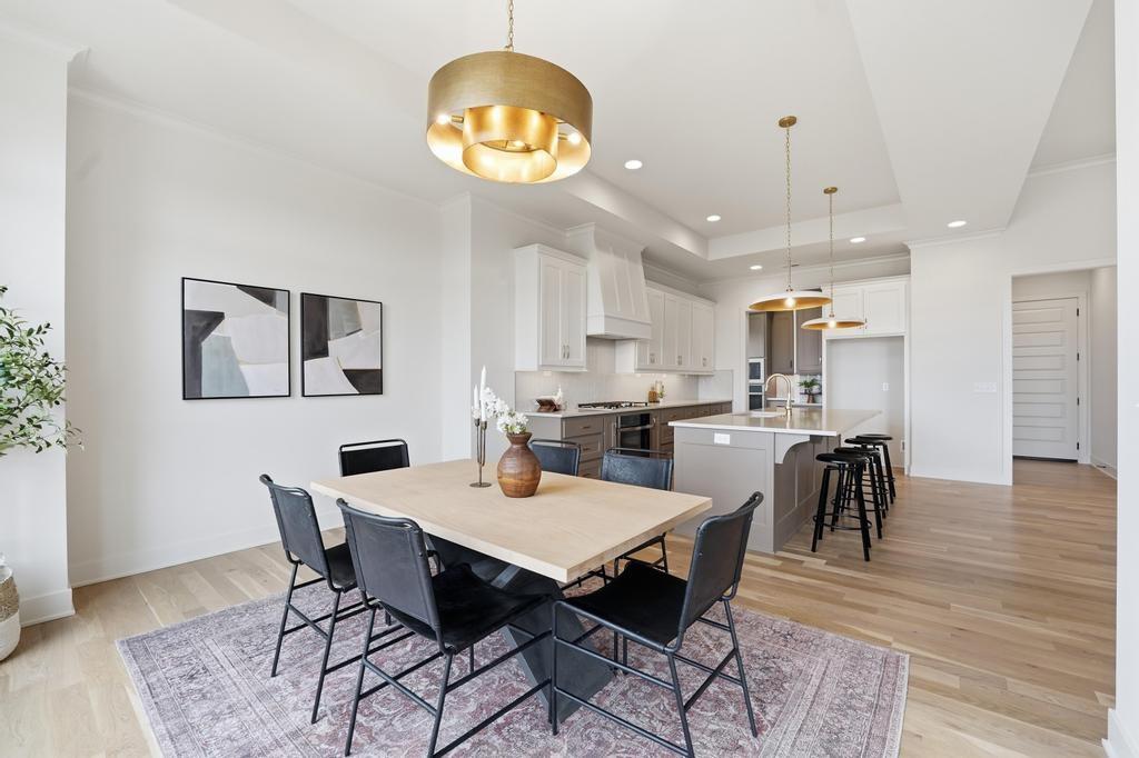 The stunning Emerson reverse 1.5 story plan by French Homes in Cedar Creek's newest community - The Estates of Canyon Oaks. Located in the award-winning Olathe School District, this reverse 1.5 story home has 4 beds, 3.5 baths, 3 car garage and sits on a walkout lot on a cul-de-sac. Step inside the double wide doors into the entry which leads you to the spacious family room with wood floors and fireplace with built-in cabinet surrounds. The gourmet kitchen features an island, custom cabinets with hood, cooktop, built in oven/micro and a generous sized prep pantry with storage, sink and beverage cooler. The eat-in dining space has a built-out space perfect for a hutch and also connects to the covered deck - perfect for morning coffee. The private main level primary suite offers a spa-like bathroom that includes double vanities, free-standing tub, shower with bench and a huge walk-in closet that conveniently connects to your laundry room. Main level also has a second bedroom, full bath and a mudroom with bench off the garage. The walkout lower level includes a large rec room with second fireplace, wet bar with island and two additional bedrooms, 3rd full bath and a half bath perfect for guests. Plenty of unfinished storage space left too. Enjoy Cedar Creek's amazing amenity package that includes 3 neighborhood pools, community clubhouse with exercise room and indoor basketball court, lit pickleball and tennis courts, access to 65 acre lake, monthly neighborhood events, walking trails and more.