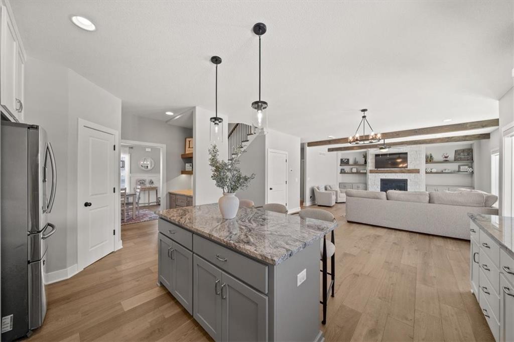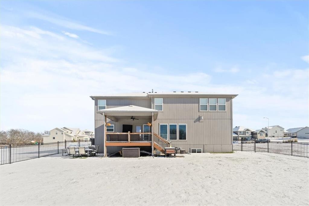 Welcome to your dream home in the highly desirable Benson Place Landing! This exquisite 2-year-old home blends the best of comfort, thoughtful design, and unbeatable location. Enjoy the feel of new but with upgrades you won’t find in current new construction. Step inside to discover an open yet defined layout, perfect for both everyday living and entertaining. Gorgeous ceiling beams accent the expansive great room, while the flexible front room, complete with wainscoting, offers space for a formal dining area, home office, or playroom. The kitchen is a showstopper, featuring a convenient coffee bar, stone countertops, and generous storage. Upgrades that truly set this home apart: Designer light fixtures throughout: modern, stylish, and energy-efficient. Beautifully landscaped yard for instant curb appeal and outdoor enjoyment. Newly installed iron rod fencing in backyard. An extended concrete patio ideal for gatherings, grilling, or relaxing. 4-car tandem garage, equipped with its own electric heater provides endless options: extra vehicles, storage, workshop, home gym, or creative space. Unwind in the sprawling primary suite with a spa-inspired bath, oversized walk-in closet, and direct access to the laundry room for ultimate convenience. Step outside to the covered 14x12 deck. Enjoy unbeatable community amenities: (2) swimming pools, splash park, playground with soccer goals, miles of scenic trails, and lush nature areas, all just steps from your door. Commuters will love the quick access to I-435, I-35, and 152 Hwy, only 20 minutes to KCI or downtown Kansas City! Don’t miss your chance to own this like-new, move-in ready home with premium upgrades and a prime Northland location.