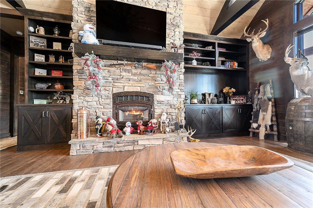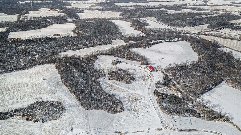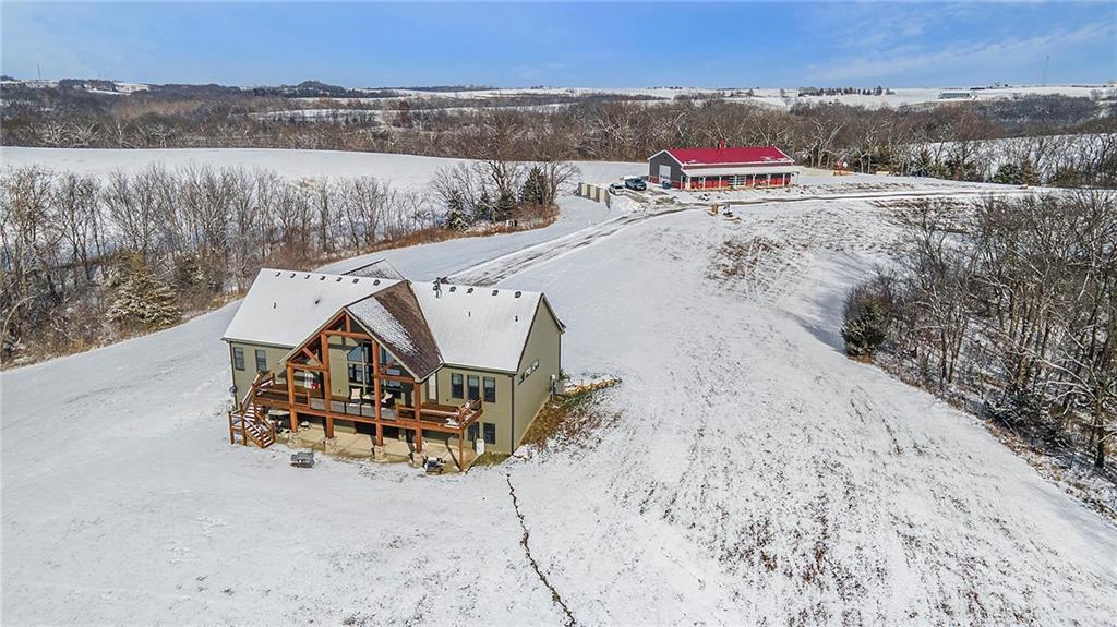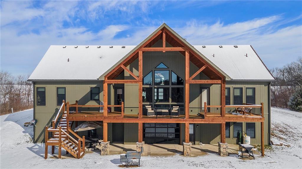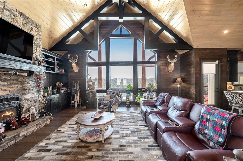 Exceptional custom-built, lodge-inspired home situated on approximately 60± scenic acres, offering privacy, panoramic views, and quality craftsmanship throughout. The home features a striking great room with vaulted ceilings, exposed timber beams, tongue-and-groove pine walls and ceilings, and a floor-to-ceiling stone fireplace with custom built-ins. The kitchen is thoughtfully designed with high-end stainless steel appliances, custom cabinetry, and generous workspace. The primary suite offers a private retreat with a spa-like bath featuring a copper claw-foot soaking tub. Warm wood tones, stone accents, and expansive windows create a seamless connection to the surrounding landscape. Outdoor living includes a covered deck and patio overlooking rolling terrain and timber. The property includes two outbuildings and a mix of open ground and wooded acreage, ideal for hunting, recreation, and nature enjoyment.
