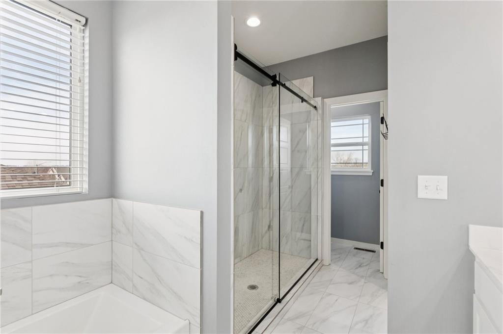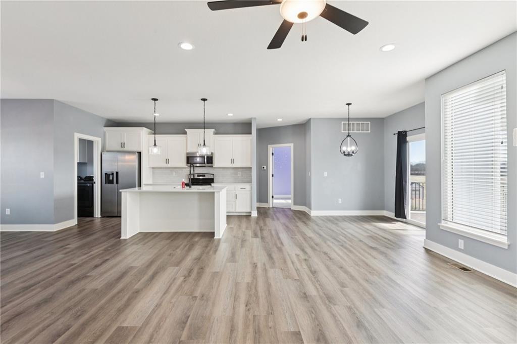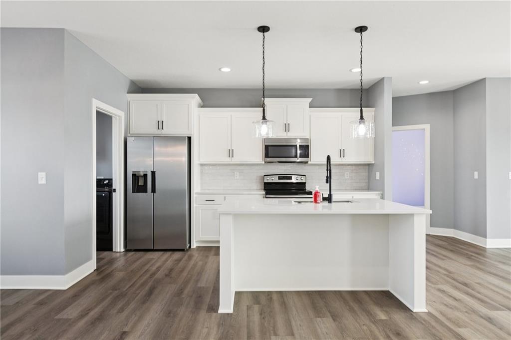 This beautifully maintained, 5-year-old split-entry home feels welcoming the moment you walk in. The open floor plan creates a bright, easy flow between the living, kitchen, and dining areas perfect for everyday life and entertaining. The kitchen is both beautiful and thoughtfully designed, complete with a pantry, and all appliances stay, including the refrigerator, washer, and dryer. Main-floor laundry adds everyday convenience. The primary suite is tucked away for privacy and offers a double vanity, soaking tub, stunning walk-in shower, and a generous walk-in closet. Two additional bedrooms and a full bathroom sit on the opposite side of the main level, giving this home a true split-bedroom layout. Downstairs, the finished walk-out basement expands your living space with a large rec room, a 4th bedroom, and a 3rd full bathroom, plus walkout access to the patio. Enjoy relaxing on the covered deck, all set on a quiet corner lot with the added curb appeal and function of a side-entry 3-car garage.