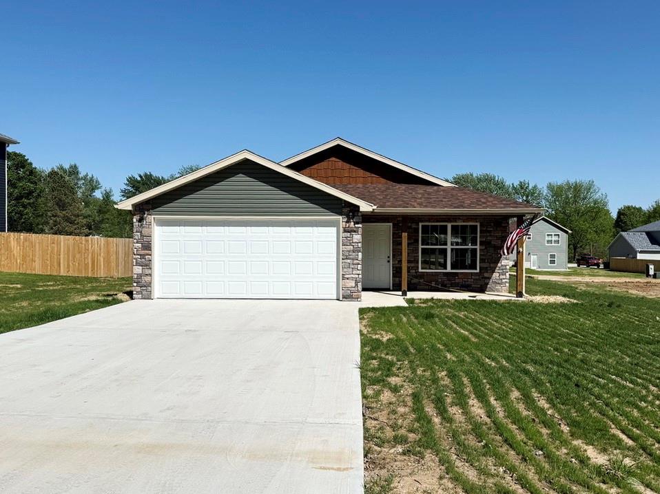 New-Construction Ranch Home in El Dorado Springs: This new-built home, located in a beautiful neighborhood on the south side of El Dorado Springs, will be ready for its first owner in January 2026. The 1,401 sq ft home sits on a level .26-acre lot surrounded by a neighborhood of newer homes. The maintenance free exterior showcases an attractive combination of siding and stone and accented by a front patio and a back BBQ/coffee patio. The main living space is a combination of the living room, dining room, and kitchen that is perfect for entertaining and allows for tons of natural lighting with 2 west-facing windows and 3 south-facing windows. The custom cabinets, with soft-close doors and drawers, granite counter tops, kitchen island, LED lighting, and new black appliances make this a top-tier and attractive kitchen. There are 3 bedrooms and 2 bathrooms with one bathroom ensuite to the master. A 2-car garage is attached. This home has no steps, a 1-year builder’s warranty, low maintenance, and a perfect location for walking, biking, and quick errands to town. Call today and schedule a private showing as the final touches are being finished on 1803 S Elm St in El Dorado Springs.
