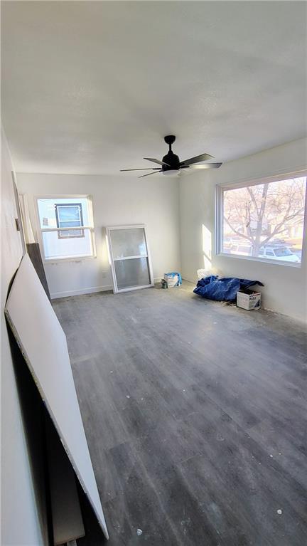 Living room featuring healthy amount of natural light, wood finished floors, and a ceiling fan