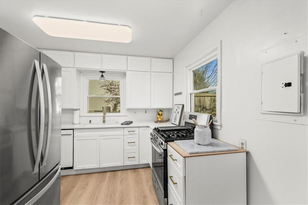 Discover your dream home in the heart of Independence, where classic charm meets modern luxury in this beautiful move-in ready ranch. Step inside to an open-concept living area that glows with natural light, highlighting the seamless luxury vinyl plank flooring that flows into an elegant eat-in kitchen. This chef-inspired space is a showstopper, featuring crisp white shaker cabinets, durable quartz countertops, and a sleek stainless steel appliance suite including a premium gas range. The attention to detail continues in the spa-like bathroom, boasting a stunning walk-in tile shower with a built-in bench, contemporary matte black fixtures, and a stylish marble-topped vanity. Outside, the property offers incredible versatility with a large level lot and a detached one-car garage perfect for a workshop or extra storage. Relax on the private back deck overlooking your spacious yard—an ideal setting for weekend gatherings or a peaceful morning coffee. Located in a quiet, established neighborhood with easy access to local amenities, this turnkey single-family home is a rare find for first-time buyers or those looking to downsize without compromising on style. Don't miss this opportunity to own a modern oasis with significant curb appeal and high-end finishes throughout.