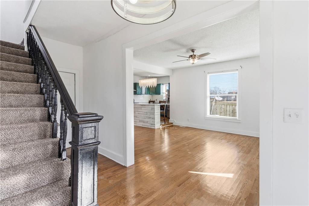 Enjoy your mornings or evenings from the inviting front porch of this charming home. Inside, you’re welcomed by beautiful hardwood floors that flow into the living room, where a stone fireplace creates a warm and cozy ambiance. The kitchen features painted cabinets, a tile backsplash, granite countertops, and a functional island. A formal dining room provides ample space for a full-size table, while a convenient laundry room with half bath is located on the main level. Upstairs, the spacious primary bedroom includes built-in shelving for added character and storage. The updated full bathroom offers a tiled shower, tile flooring, a newer vanity, and granite countertops. The attic space presents exciting potential for additional bedrooms or living space if desired. Outside, enjoy easy alley access at the rear and a nearly completed fenced yard. Located in a highly central area close to shopping and dining, this home offers comfort, charm, and opportunity all in one.