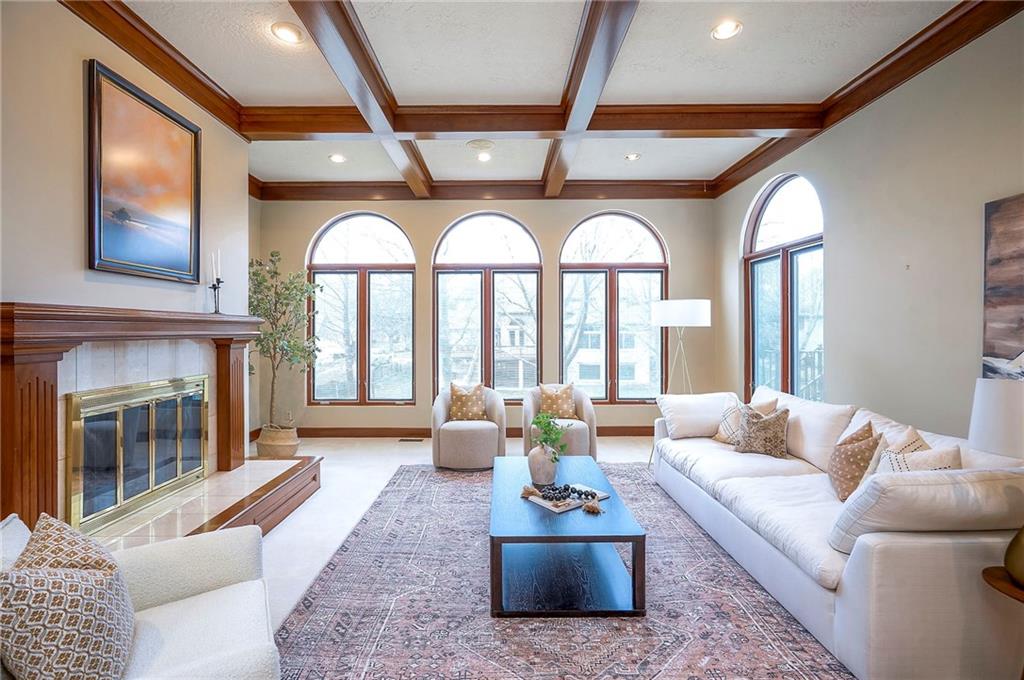 Welcome to this expansive and well-built 1.5-story home offering 4,224 square feet on the main & second floors, plus a large finished walkout basement with 1,500 finished square feet. The home sits on a beautifully landscaped lot in a prime Overland Park location. You’re greeted through a leaded glass front door from a charming courtyard into an impressive two-story entry, where a nearby three-story fireplace anchors the home & immediately showcases its grand scale. The main level features a spacious living room with wood beams, a fireplace & abundant natural light. A large formal dining room easily accommodates entertaining on a grand scale. The kitchen boasts several high-end Wolf appliances & a four-burner gas stove with a griddle. Just off the kitchen is an exceptionally large laundry room. The main-floor primary suite features a vaulted ceiling, generous closet space, and an en-suite bath with separate tub and shower and extensive storage. The second floor offers three very large bedrooms, excellent closets, and two and one-half bathrooms. The half bathroom could potentially become a second laundry room. There is also a bonus room featuring a wet bar, a fireplace and a large vaulted ceiling. It has the potential to serve as a second primary suite. The finished walkout basement is designed for entertaining, with a large bar, multiple gathering areas, wine storage, an additional bedroom and full bath, and access to a spacious patio. There is also significant unfinished space. Additional highlights include a huge deck overlooking the private lot, mature landscaping, a deep side-entry garage well-suited for large SUVs, trucks, and storage, zoned HVAC, partial HVAC replacement, and a major investment in several newer windows. This home offers a rare opportunity—exceptional bones, generous proportions, and a premier location with excellent schools, quick highway access, and nearby shopping and dining—ready for the next owner to bring their design vision to life.