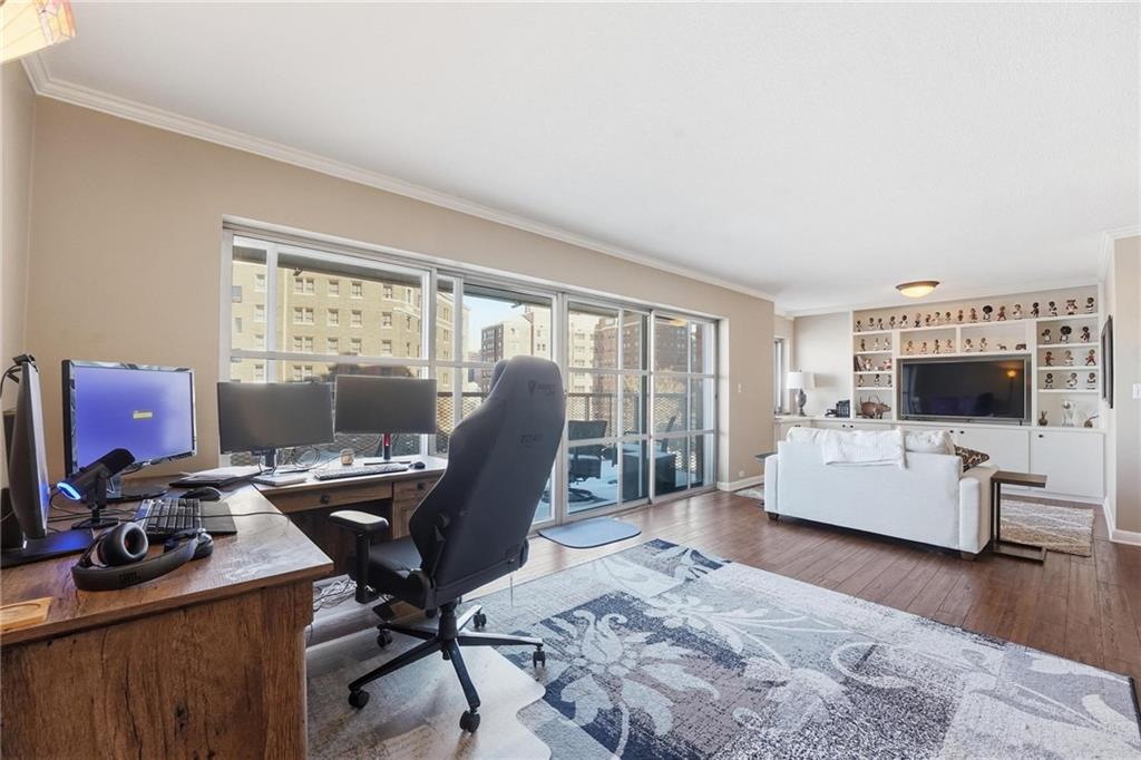 Enjoy sweeping views of the Plaza skyline from your private balcony, living room, kitchen, and bedroom. This exquisitely remodeled Plaza condo boasts an open floor plan, complemented by rich wood flooring and custom cabinetry throughout. The thoughtfully designed kitchen maximizes space with a functional island offering built-in storage, indirect lighting, a pantry, and more. The updated bathroom includes a walk-in shower and a tall vanity. The oversized primary bedroom offers a double lighted ceiling fan and a spacious walk-in closet. Recent building improvements include a community room and patio, elevators, temperature-controlled garages, balconies, roof, HVAC systems, and more. Owners are only responsible for the internet (Google Fiber–wired building), cable, and electricity. A temperature-controlled garage spot is offered to every owner at an additional cost. Schedule your showing today and discover all this building has to offer.
