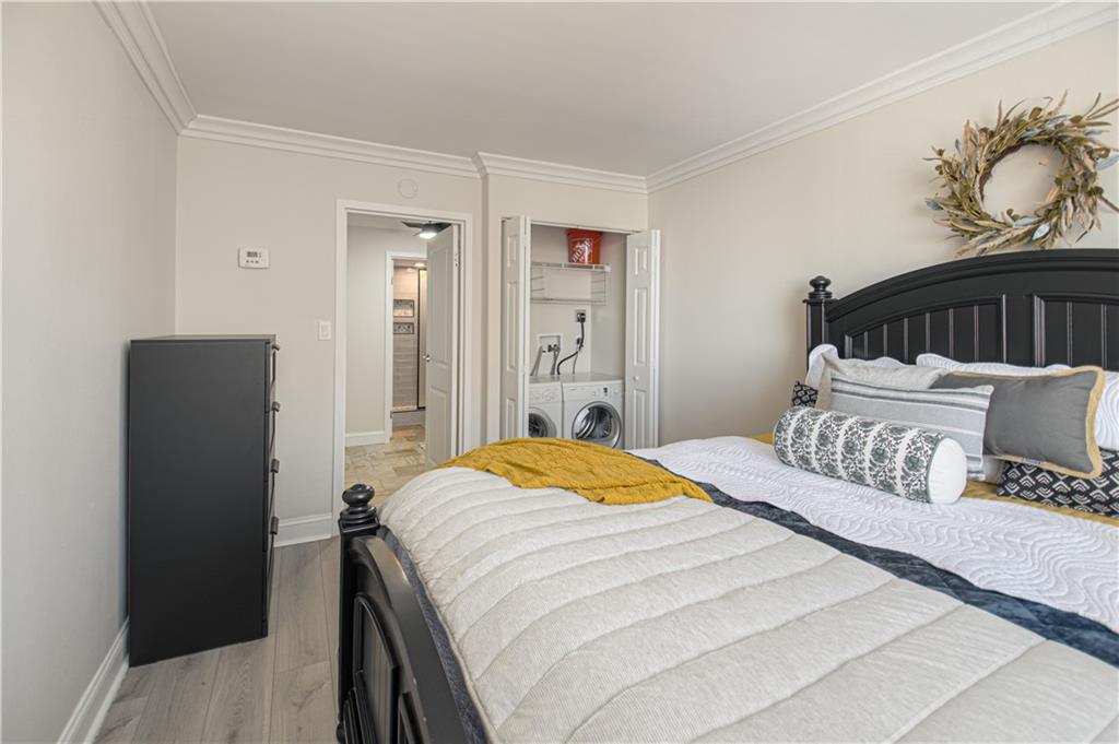 DONT MISS THIS! Welcome to this updated 1-bedroom, 1-bathroom condo at the Manhattan Condominium. This clean, move-in-ready unit features thoughtful updates that make it comfortable and appealing. Inside you'll find fresh LVP flooring throughout the unit, complemented by new crown molding, updated light fixtures, and new custom blinds. The real star of this home is the luxurious, spa-like bathroom with a stunning walk-in shower featuring beautiful tile work, modern fixtures, and a rain showerhead—a true retreat! The kitchen has been refreshed with new upper cabinets and includes a new refrigerator and microwave. The primary bedroom features a convenient laundry closet with a Bosch washer and dryer—no shared laundry facilities! Unit is being sold partially furnished, including a bed, dresser, futon in the living room, dining table with 4 chairs, kitchen utensils and cookware, living room TV and stand—perfect for those looking for a turnkey living situation or investment property! This well-maintained condo offers clean, comfortable living with some great updates where it counts. Perfect for anyone looking for a simple, functional space with one truly beautiful feature! Manhattan Condominium offers resort-style living with incredible amenities: a penthouse indoor pool, movie theatre, expansive gym with YouTubeTV, WiFi throughout the building, entertainment and grilling areas, elegant lobby, beautician and coffee shop on-site, and 24-hour maintenance services. There's a dog park nearby for your furry friends! Embrace hassle-free living with utilities, trash, and recycling included in HOA fees. Enjoy the security and convenience of a private garage with an assigned parking spot and additional storage unit. Long-term leasing is allowed, making this an excellent opportunity for investors or buyers seeking rental income potential.