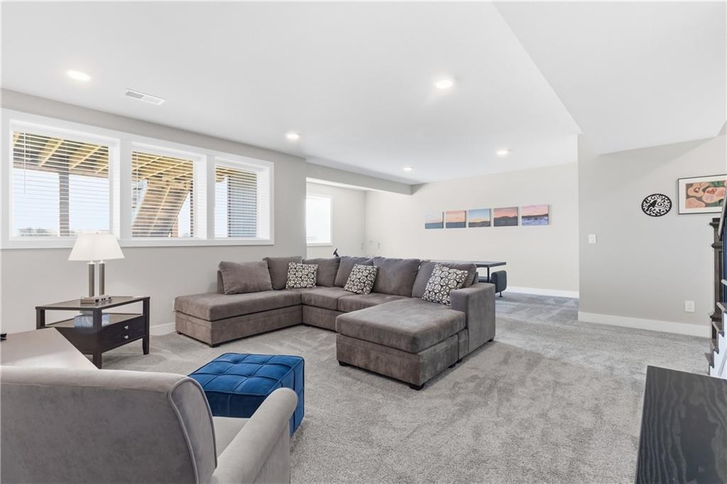 Enjoy the most gorgeous Kansas sunsets from your back deck at this beautiful and like new reverse ranch "Wheeler" plan, with so much natural light and space for everyone. Built just 3 years ago, this home welcomes you in, with a main floor office/guest suite, mudroom and laundry room, and oversized 3 car garage. Primary suite overlooks green space, complete with a massive ensuite providing a soaker tub, walk-in shower, and wonderful storage. Kitchen built to host, with spacious pantry, beautiful island, and dining space. The basement has barely been used - providing 2 bedrooms each with walk-in closets, a living space, and room for games. Upgrades throughout - and pride of ownership shows. Home sits across the street from award winning elementary school, and neighborhood provides such amenities like fitness center, sport courts, splash pad, park and pool! Totally turnkey with all the upgrades.